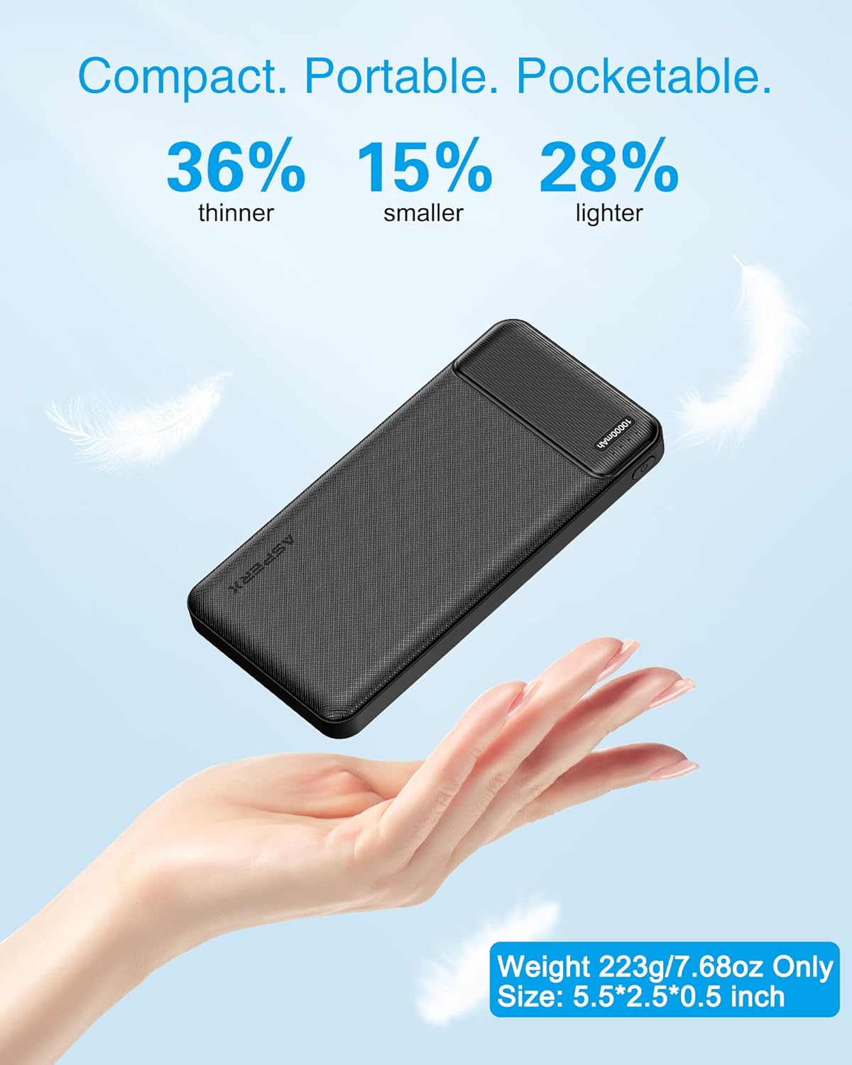 - 【Ultra-Thin】This portable battery pack is only 0.5 inches thick and weighs only 223 grams, which can be put into any backpack, purse, or work bag. Lightweight and compact, it is a must-have for business, travel, hiking, and camping