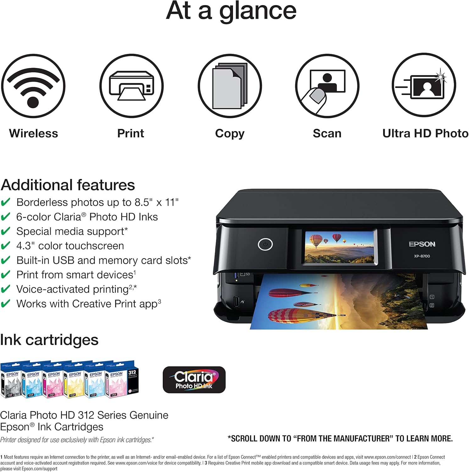 Epson Expression Photo XP-8700 Wireless All-in-One Printer with Built-in Scanner and Copier and 4.3" Color Touchscreen, Black