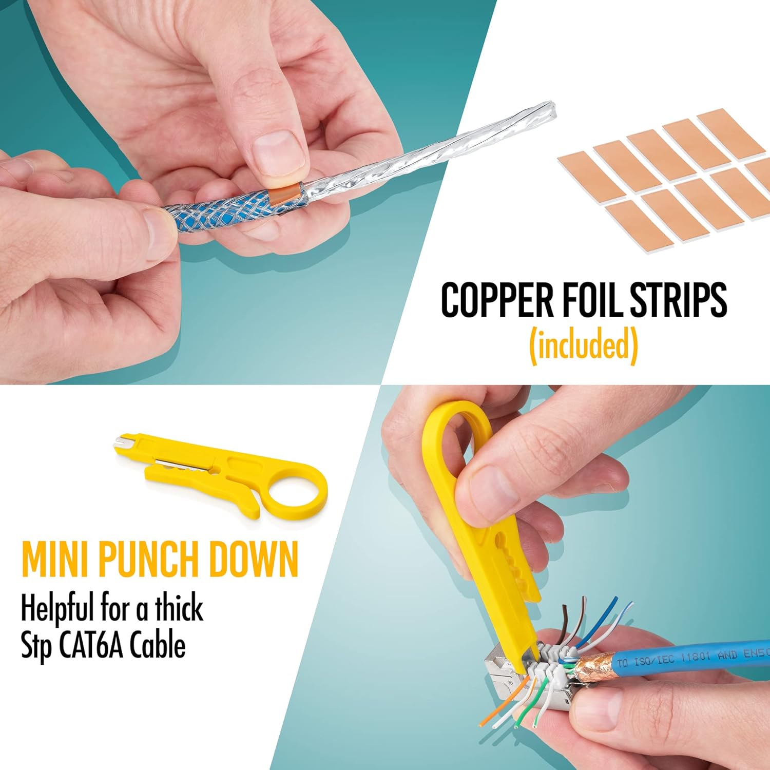 - Complete Set - Our easySHIELD cable installation set comes with 12 CAT6/6A jacks, copper foil strips for electrostatic shielding, and a multi-purpose tool for wire insertion, stripping and crimping.