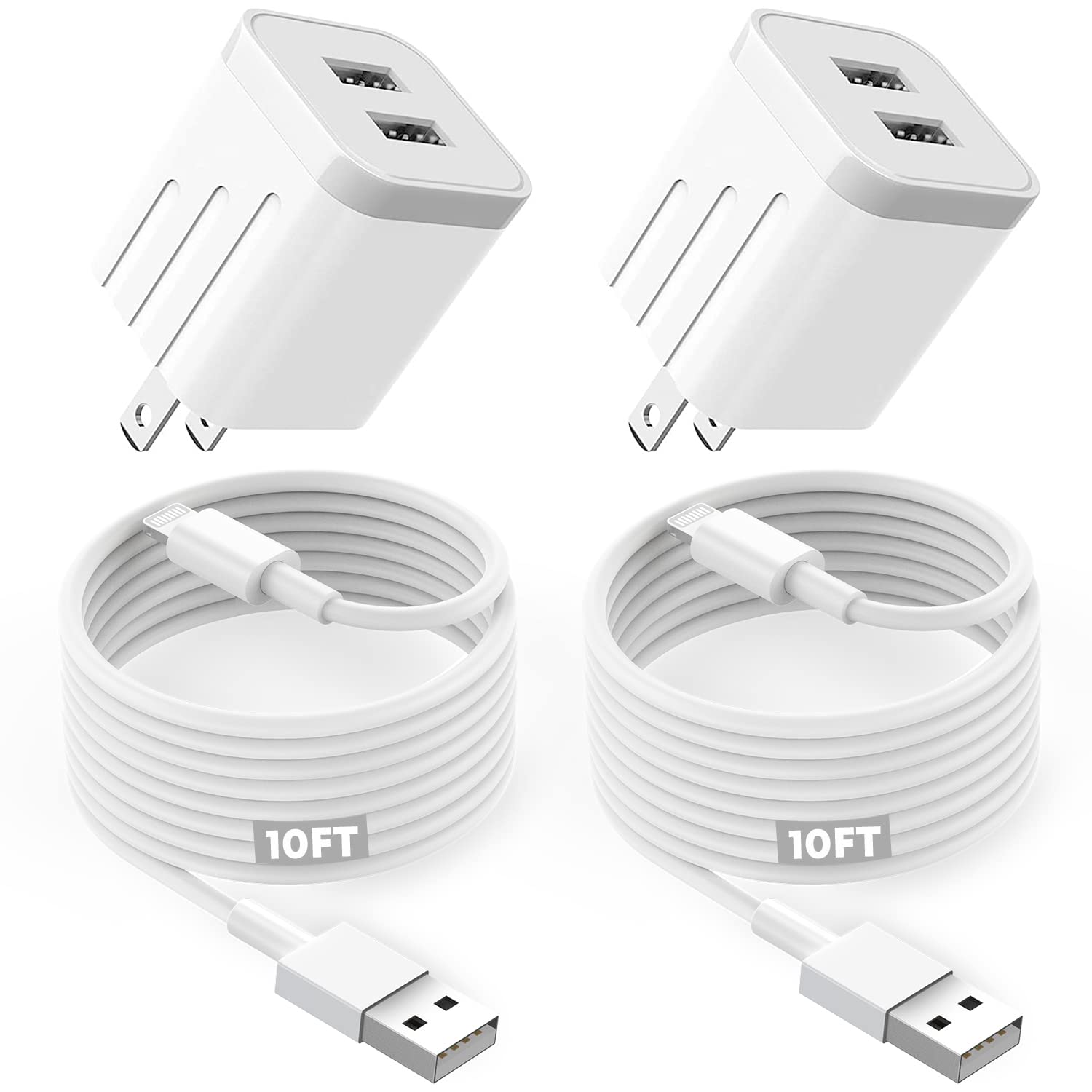 - [What You Get]:2 X MFi Certified USB to Lightning Cables in length 10ft and 2 X 2.1A iPhone Charger Block. Please feel free to contact us, Our service team will provide you with a satisfactory solution within 24 hours.