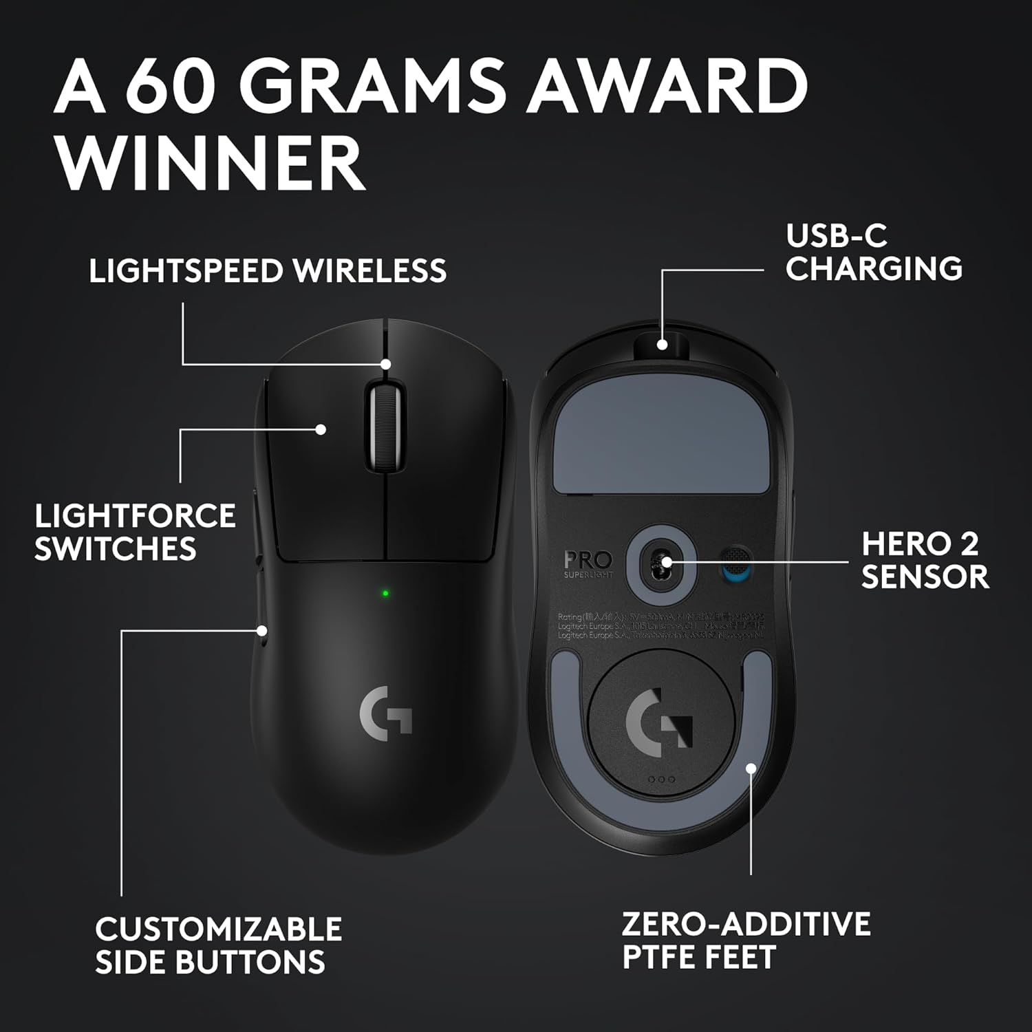 Logitech G PRO X SUPERLIGHT 2 Wireless Gaming Mouse, 60g Pro-Grade with 5 Programmable Buttons, 44k DPI Sensor, 8kHz Report Rate, USB-C Charging for PC/Mac - Black