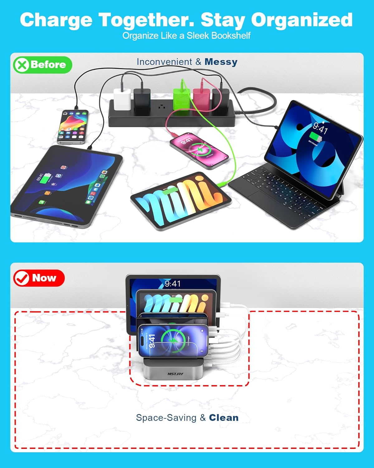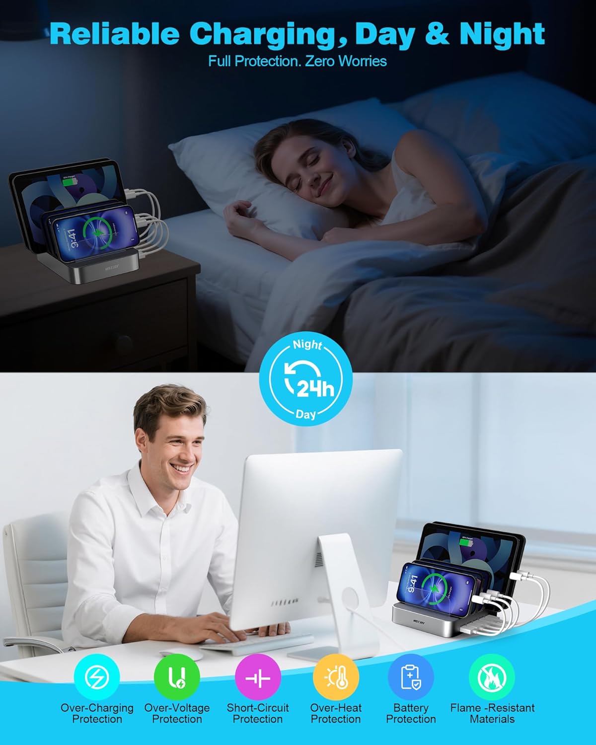 - 【Multi Protection】Every port of the multi charger station will offer exactly the charging current required to match your devices needs, keeping your phones safe. The phone charging station features a safety switch giving you a quick visual indication that it is powered on. Removable dividers can hold your large tablets even with thick case.