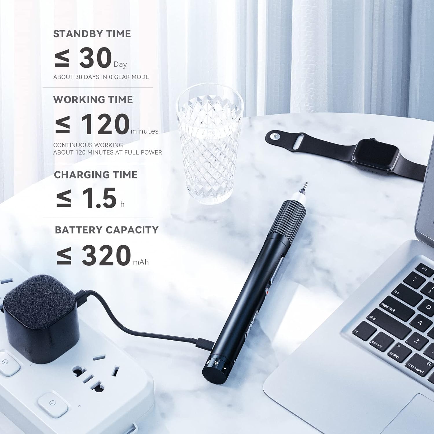 - 【RECHARGEABLE CORDLESS SCREWDRIVER SET】The standby time of this cordless screwdriver is about 30 days in 0 gear mode, the continuous working time is about 120 minutes at full power, charging time is about 1.5 h, and the battery capacity is 320 mAh.