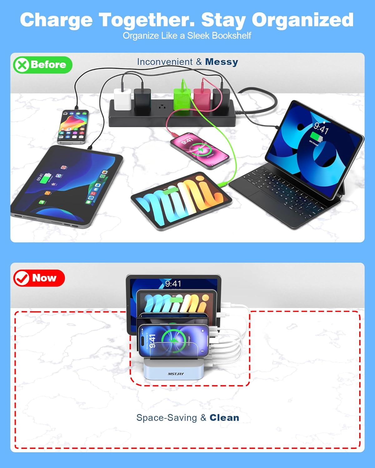 MSTJRY Charging Station for Multiple Devices : 5 Port Multi USB-A Charger Stations Multi-Device Organizer Charging Dock Designed for iPhone iPad Cell Phone Tablets (7 Short Cables Included), Blue