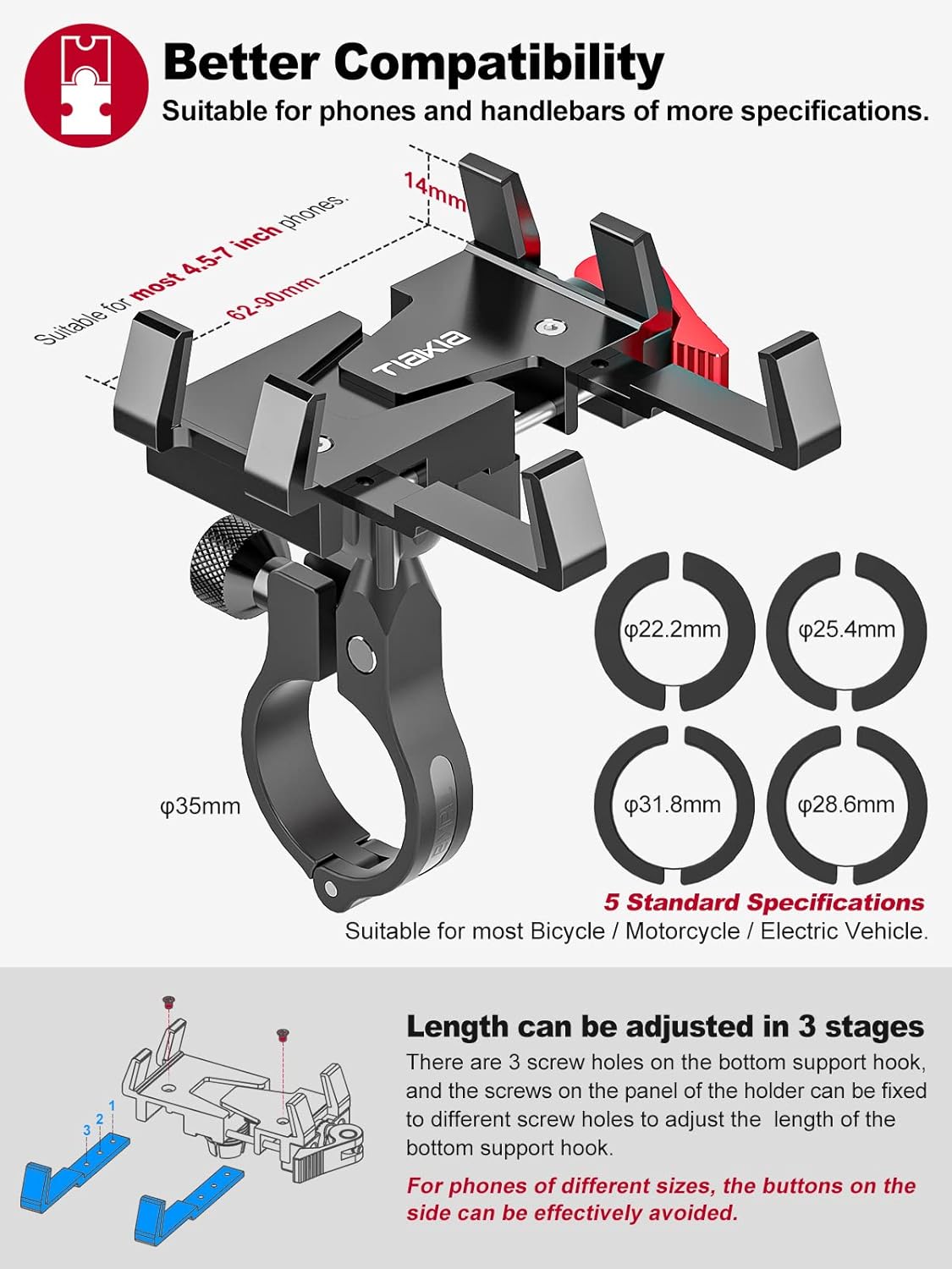 - 【6-claw advanced version bracket】 Break the tradition! The Tiakia bike phone mount holder is newly upgraded to 6 telescopic arms in structure, and the telescopic arms are added at the bottom, which makes the installation more compact and the protection more in place! In thousands of installation tests, this phone mount has shown the best stability on bicycles and motorcycles!