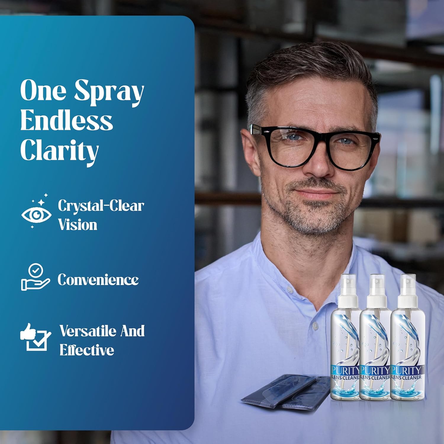 Purity Eyeglass Lens Cleaner Kit - 3 x 1oz Travel Size Lens Cleaner Spray Bottle + 2 Microfiber Cleaning Cloths - Safe for All Lenses (AR Coated Included), Eyeglasses and Screens - Clear