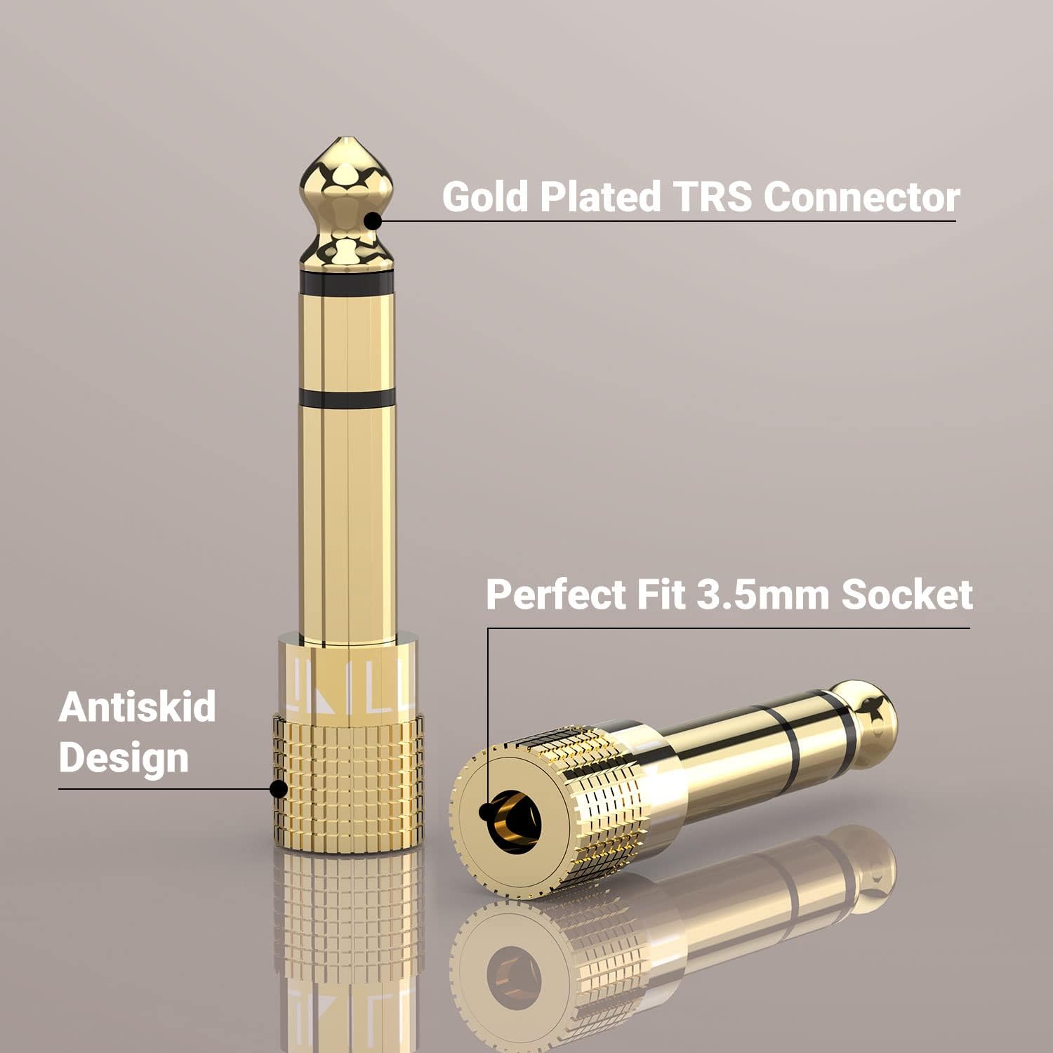 - [Plug and Play] - Cubilux 6.35mm (1/4”) to 3.5mm (1/8”) adapter allows you to plug headphones or monitors with 3-pole 3.5mm plug to 6.35mm audio jack to listen your favorite music. You could also connect line-in cables from your phone, guitar or piano to AMP, mixer or splitter for music creation.