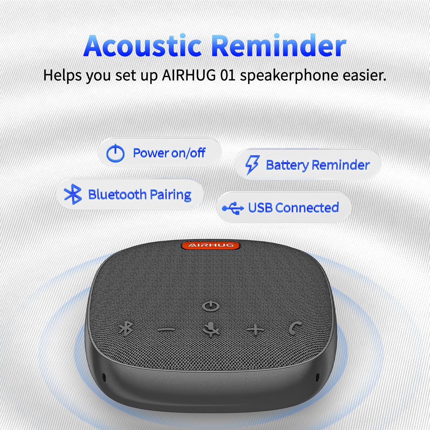 - Acoustic Reminder-You will be easy to control the AIRHUG 01 speakerphone. AIRHUG 01 provides the acoustic signal reminder when you operate power on/off, bluetooth connection and USB linking mode. Please note that,when AIRHUG 01 is in normal connection state (not in call mode), you can turn off the voice broadcast by pressing and holding the Answer/End call button for 3 seconds