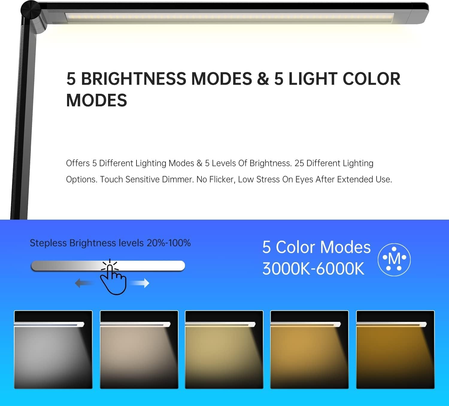 Ambertronix LED Desk Lamp with USB Charging Port, Dimmable Eye-Caring Reading Desk Light for Home, with 5 Brightness Level & 3 Lighting Modes, Touch Control, Auto Timer (Black)