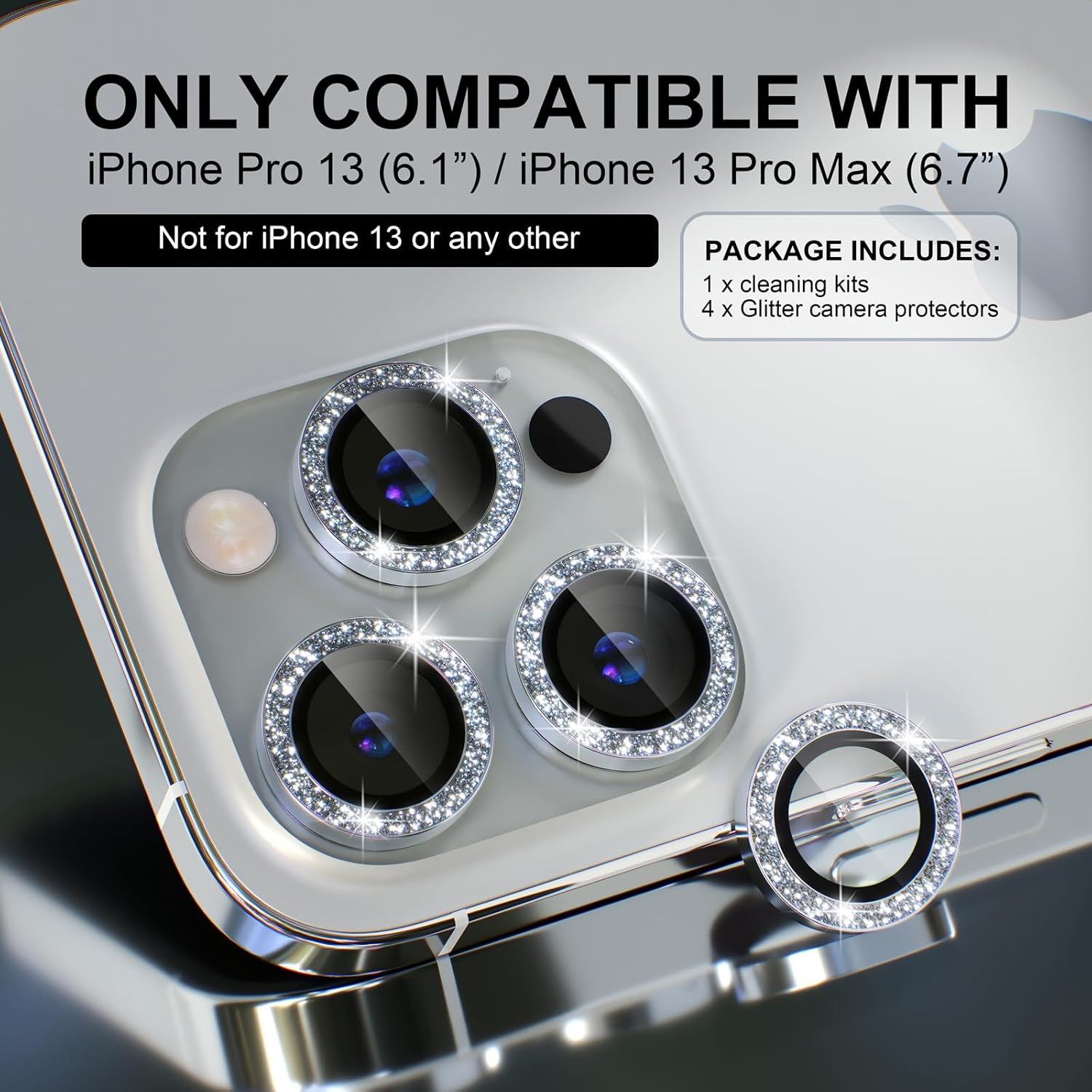 - Bling Camera Lens Protector: We present new upgrade smartphone rear camera lens Protector which perfectly fit for iPhone 13 Pro Max 6.7-inch & iPhone 13 Pro 6.1-inch 2021 released. The package contains a set delicate camera lens protector, an extra spare lens ring, and a set of cleaning kits. Please confirm the iPhone models carefully before purchase.