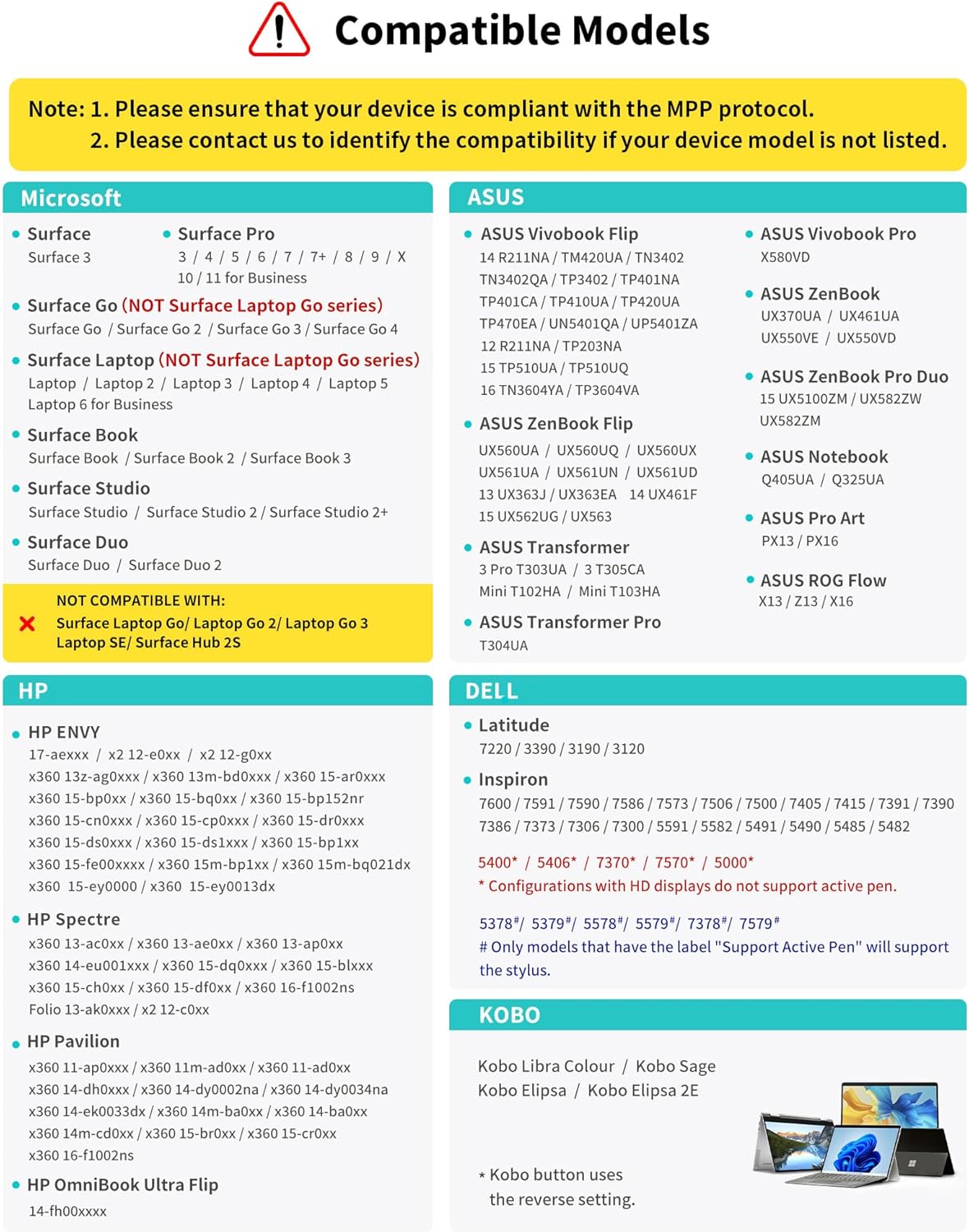 - ăWide CompatibilityăDoes NOT work with Surface Laptop Go, which belongs to a different series than Surface Laptop and Surface Go. For compatibility questions, contact us via support@metapen.com with your model number. The M1 supports up to the MPP1.15 protocol and works with most Microsoft Surface devices, as well as select models from HP, ASUS, Dell, Acer, Sony, and ViewSonic. [Surface Model List] âSurface Pro 3/Pro 4/Pro(5th Gen)/Pro 6/Pro 7/Pro 7+/Pro 8/Pro 9/Pro X/Pro 10/Pro 11, âSurface Book/Bk 2/Bk 3, âSurface Laptop/Laptop 2/Laptop 3/Laptop 4/Laptop Studio, âSurface 3, âSurface Go/Go 2/Go 3, âSurface Studio/Studio 2,âKobo Libra Colour,Kobo Sage,Kobo Elipsa, Kobo Elipsa 2E