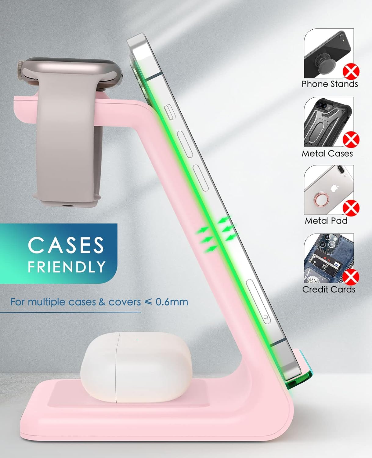 3 in 1 Wireless Charging Station, 2025 Upgraded Fast Desk Charger Station for iPhone 16 15 14 13 12 Pro Max Plus, Charger Stand for Apple Watch 10 9 8 7 6 5 4 3 2 SE, Airpods 4 3 2 Pro(Pink)
