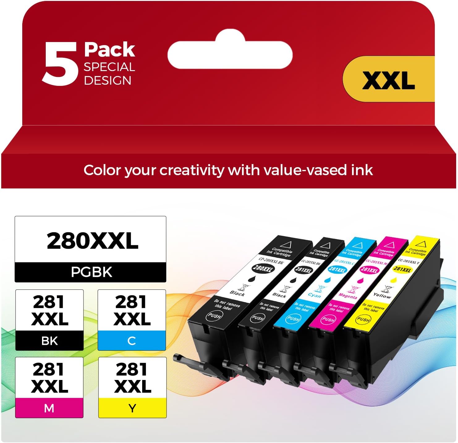 - 🎁Package Contents: 1 x User Guide, 1 x Large Black 280XXL, 1 x Standard Black 281XXL, 1 x Cyan 281XXL, 1 x Magenta 281XXL, 1 x Yellow 281XXL (Total 5 Pack)