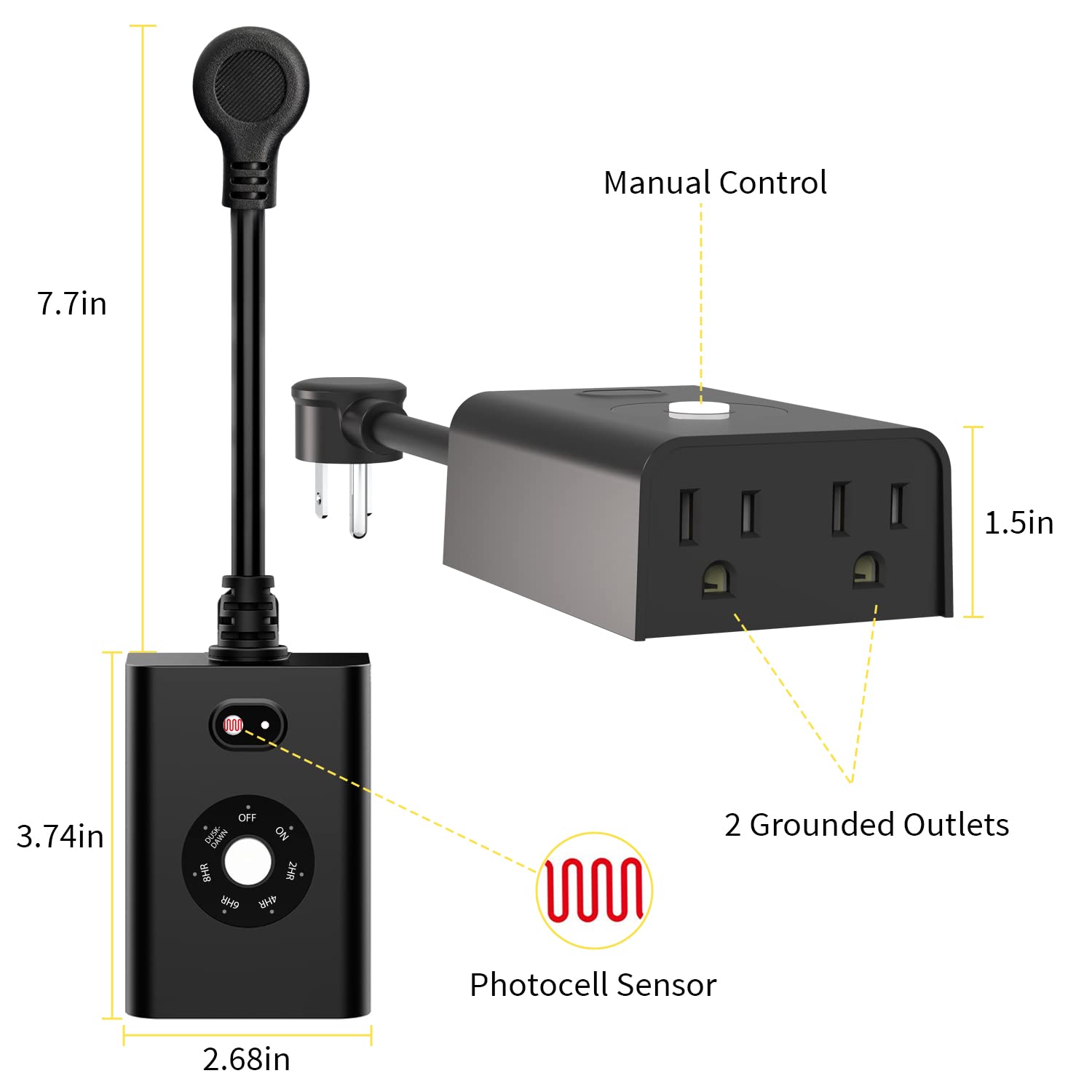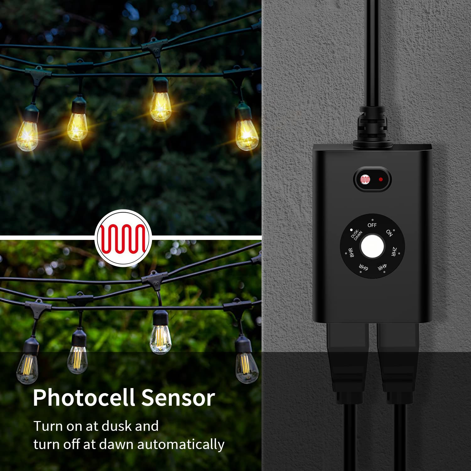 - Smart Dusk-to-Dawn Light Sensor: The built-in photocell sensor automatically turns lights on at dusk and off at dawn, offering hands-free lighting control for your yard, porch, or holiday decorations. No more manual switching—just set it and forget it