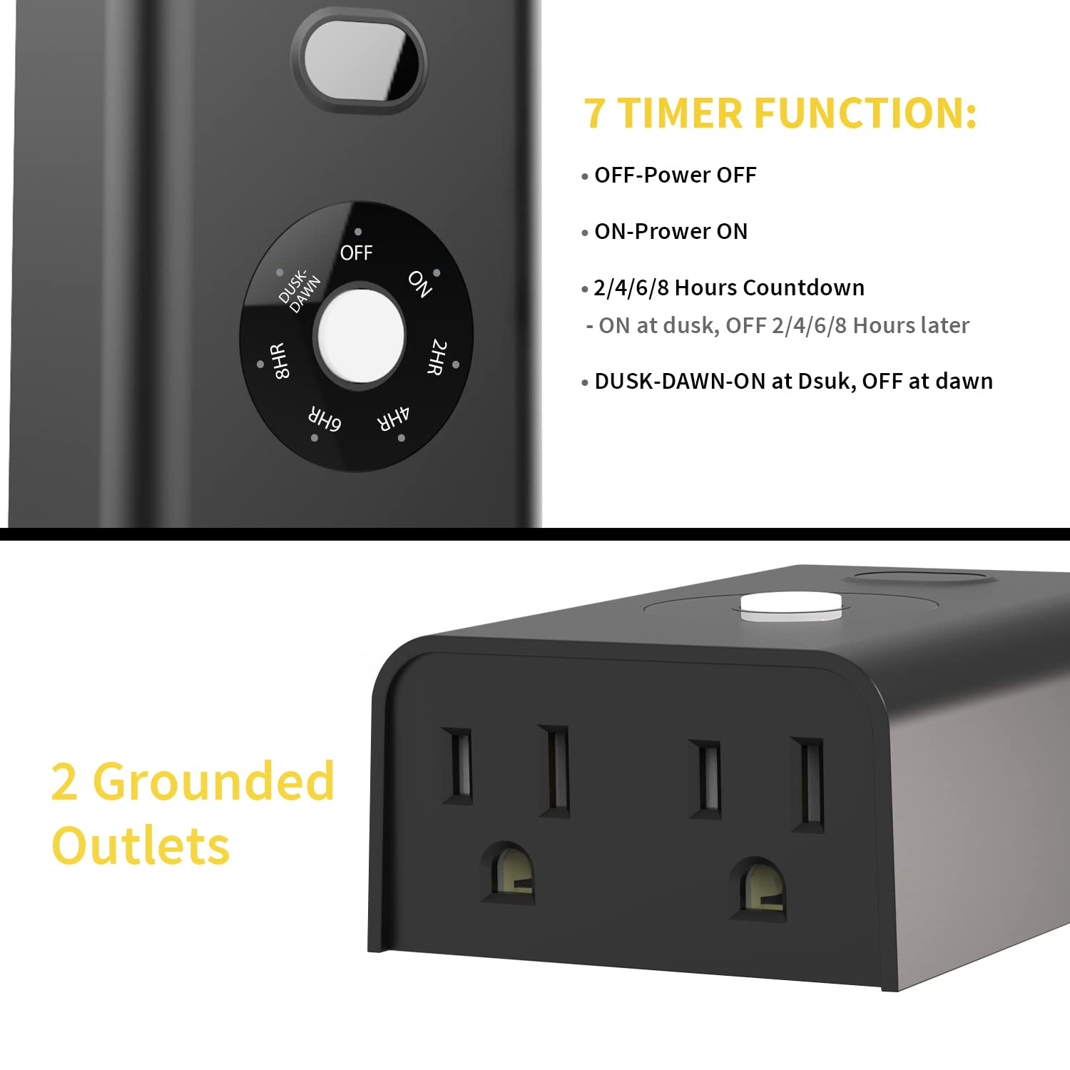 - Dual Grounded Outlets for More Power: This outdoor timer outlet features two grounded sockets, allowing you to control two devices at once. Perfect for powering garden lights, Christmas decorations, or Halloween inflatables with a single plug