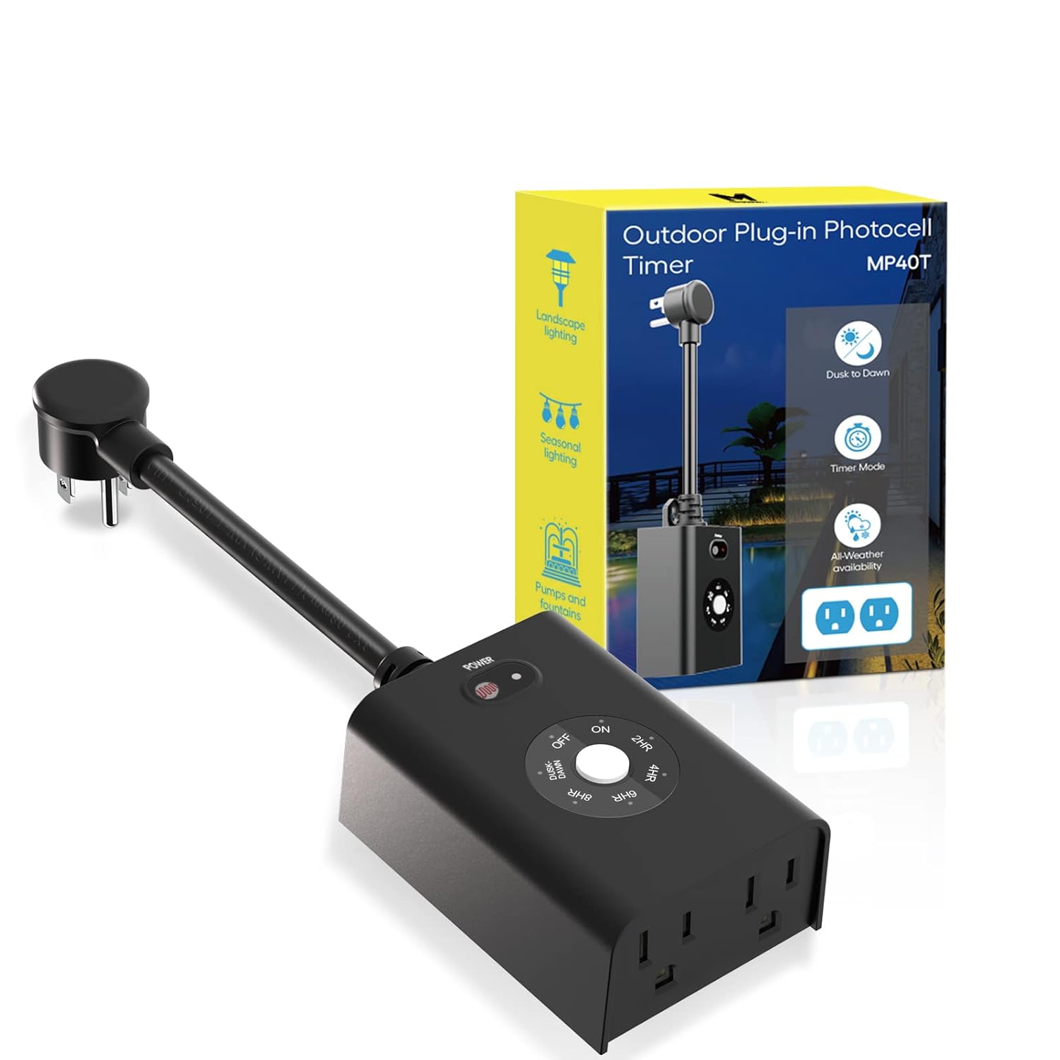 Minoston Outdoor Timer Outlet Waterproof, Dusk to Dawn Photocell Light Sensor Socket, 2/4/6/8 Hours Cutdown Timer, 2 Grounded Outlets for Christmas and Hallowen Deceration, Black(MP40T)
