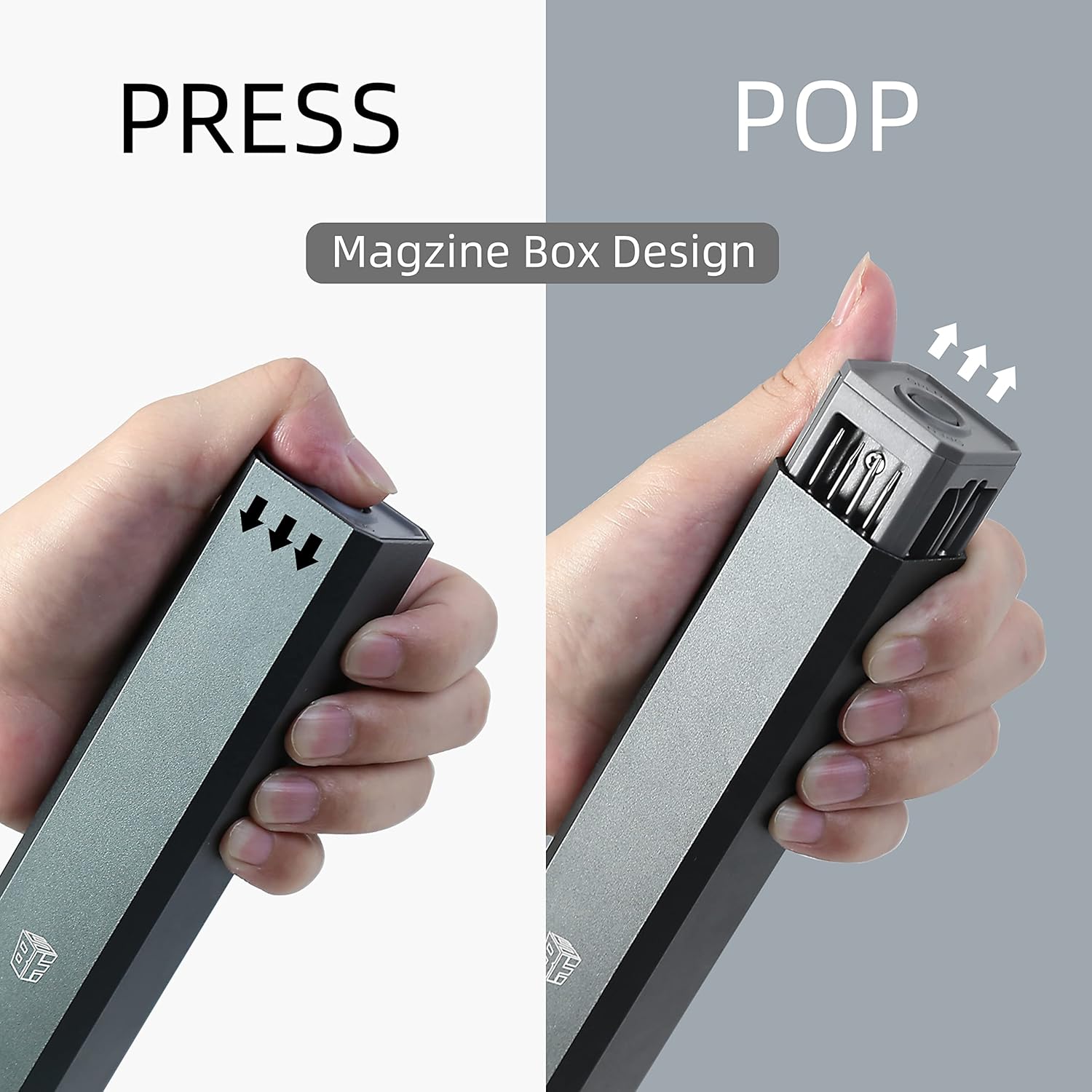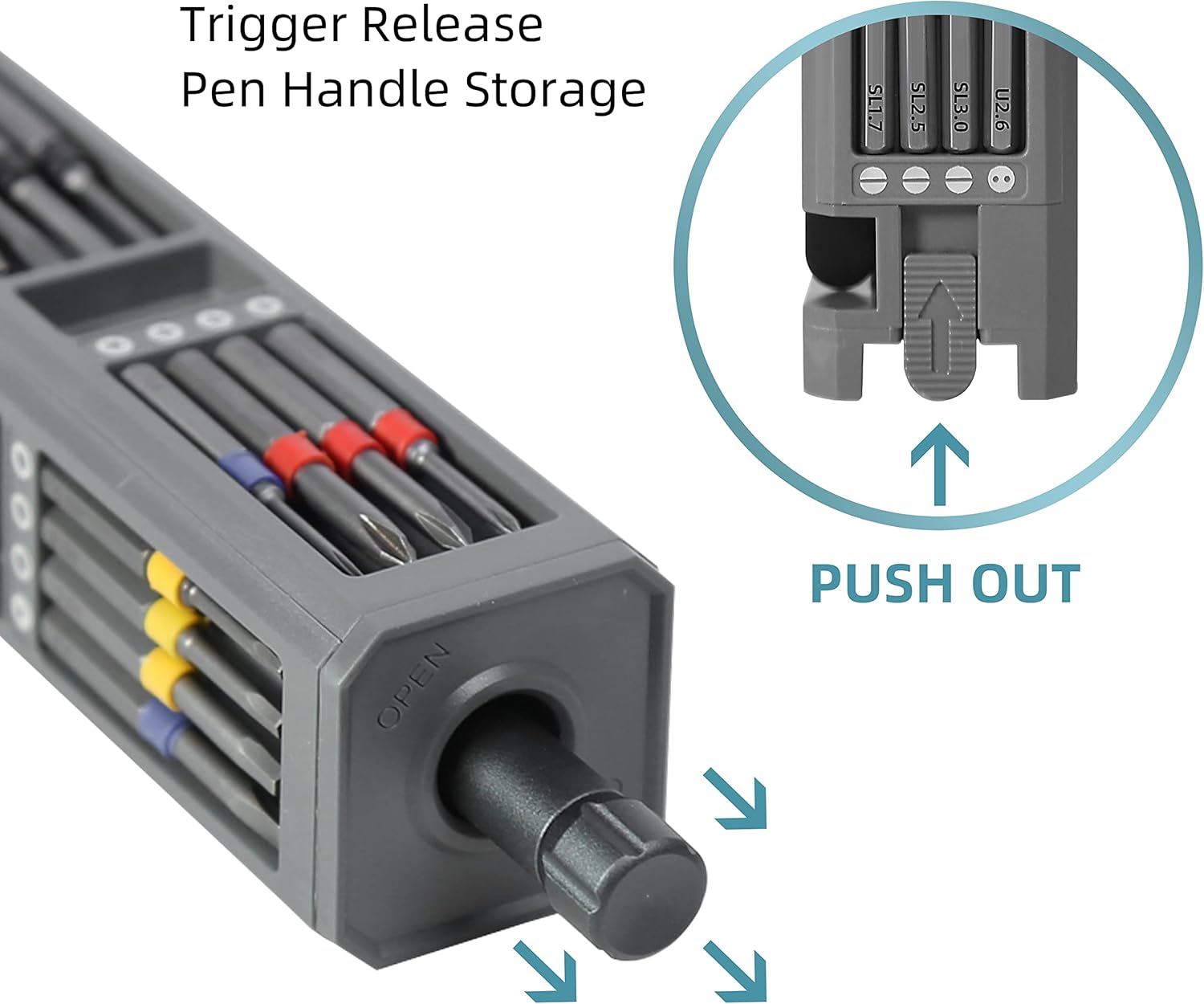 - 【EASY TO USE】Handy, anti-slip, Ergonomic Design handle comfortable to hold, color-coded identification size. Press “OPEN” button at the end of the box, and the interior slides out to reveal all bits with different colors according to their types neatly organized in their compartments and secured with magnets.