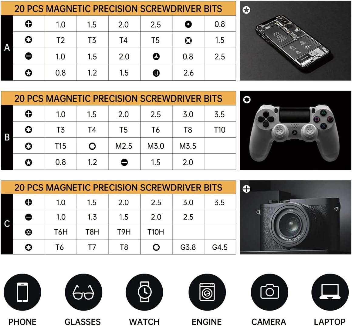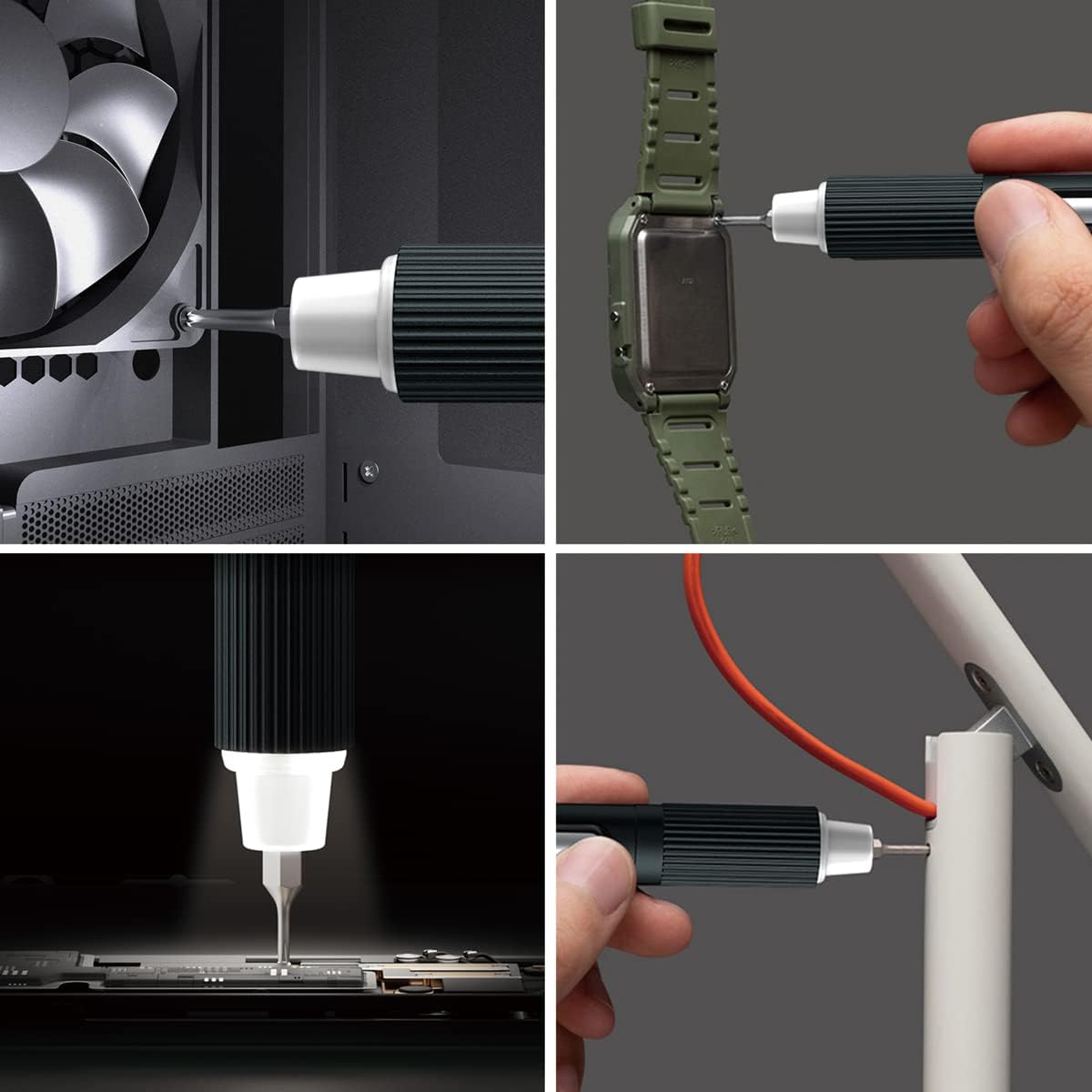 - 【Manual and Electric Screwdrivers】This precision screwdriver has dual working modes,Manual and Electric mode can be freely switched at any time according to maintenance needs.M-mode's max torque is 2Nm,E-mode'torque is 1/2/3 gear about 0.17Nm/0.19Nm/0.21Nm.Mini power screwdriver kit widely used in laptops,phones,cameras,drones,consoles,glasses, watches,toys,RC car,PS5,etc.
