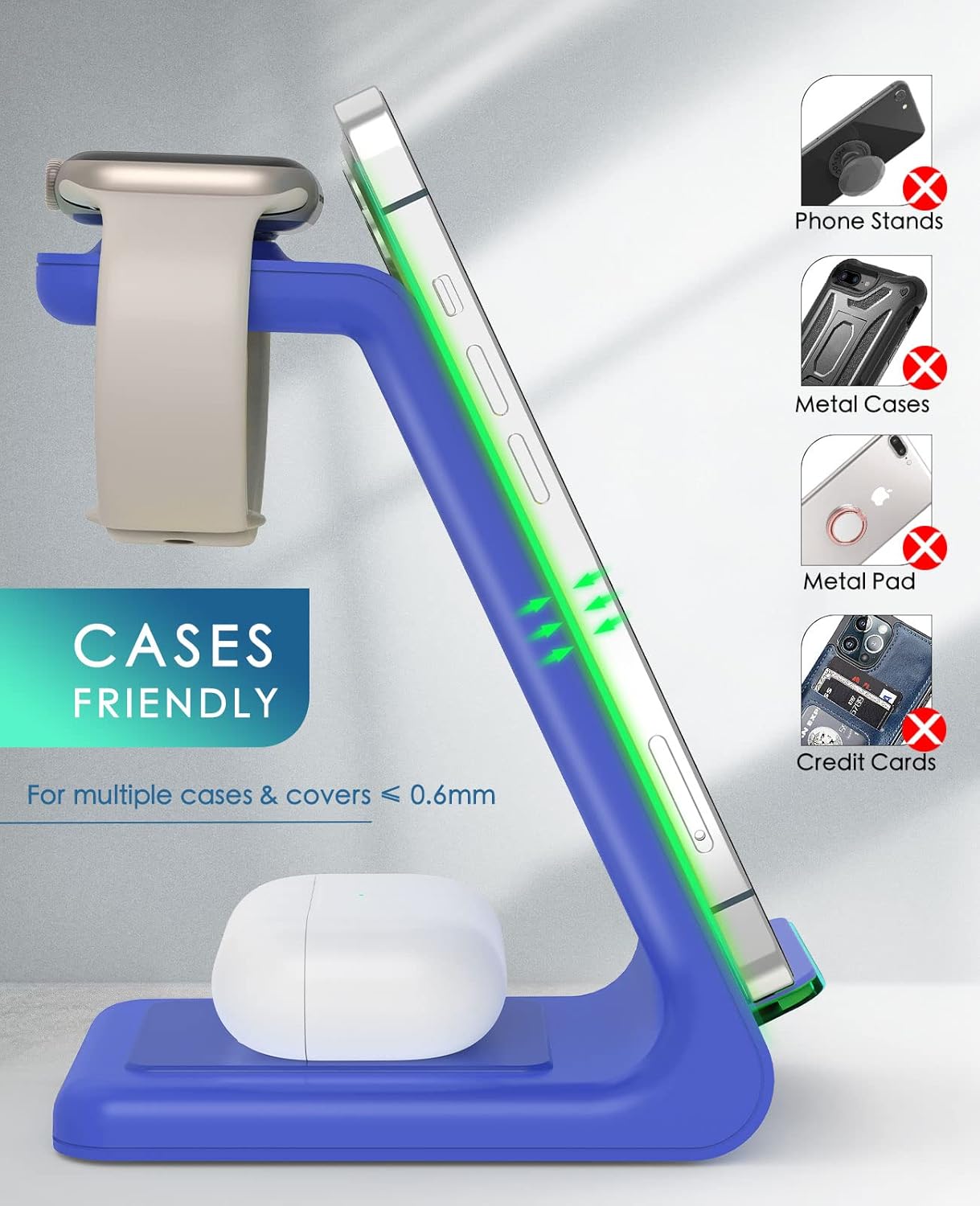 - 🛡️【𝗦𝗮𝗳𝗲 𝗖𝗵𝗮𝗿𝗴𝗶𝗻𝗴 𝗦𝘁𝗮𝘁𝗶𝗼𝗻】The wireless charging dock provides you a safe charging experience. Employing over-current protection, over-voltage protection, and over-charging protection, this fast charger ensures your charging safety. With massive heat dissipation holes on its back, charging becomes even cooler and safer. Coated with a layer of skin-like silicone, it’s 100% anti-static and can endure accidental collision or scratches