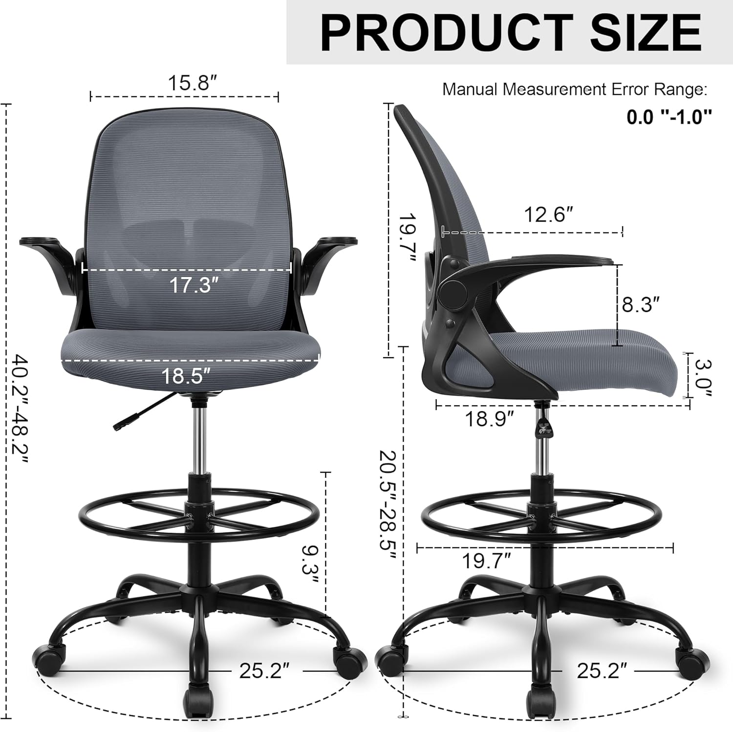 Primy Drafting Chair Tall Office Chair with Flip-up Armrests Executive Ergonomic Computer Standing Desk Chair with Lumbar Support and Adjustable Footrest Ring(Dark Gray)
