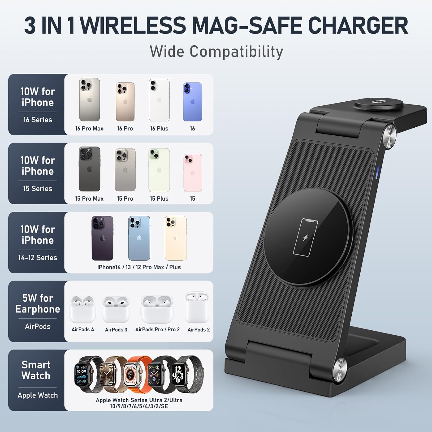 - 2025 Upgraded 3 in 1 Foldable Wireless Charger: The charging station for multiple devices, compatible with iPhone, iwatch, AirPods simultaneously. It is suitable for all iPhone 12-16 series. Compact size, well built, fast charging, space-saving, exactly what you need. Gifts for people who travel for work OR international travelers