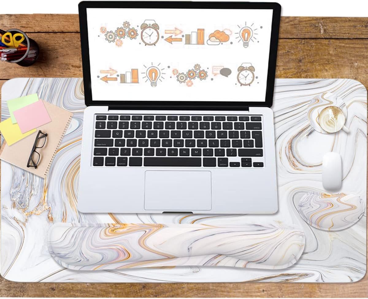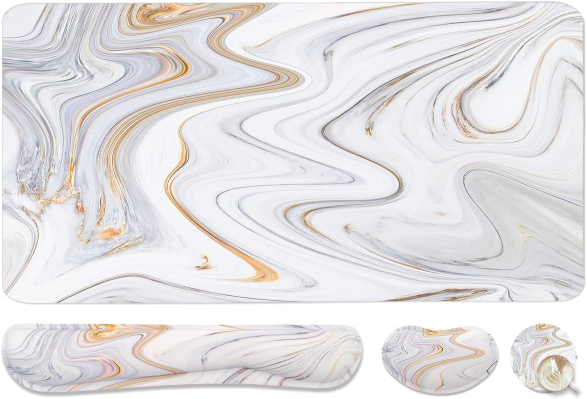 4-in-1 Large Gaming Mouse Pad, Keyboard Wrist Rest Pad & Wrist Support Mousepad Set, Extended Desk Pad Waterproof Desk Mat for Home Office Study Game - White Marble