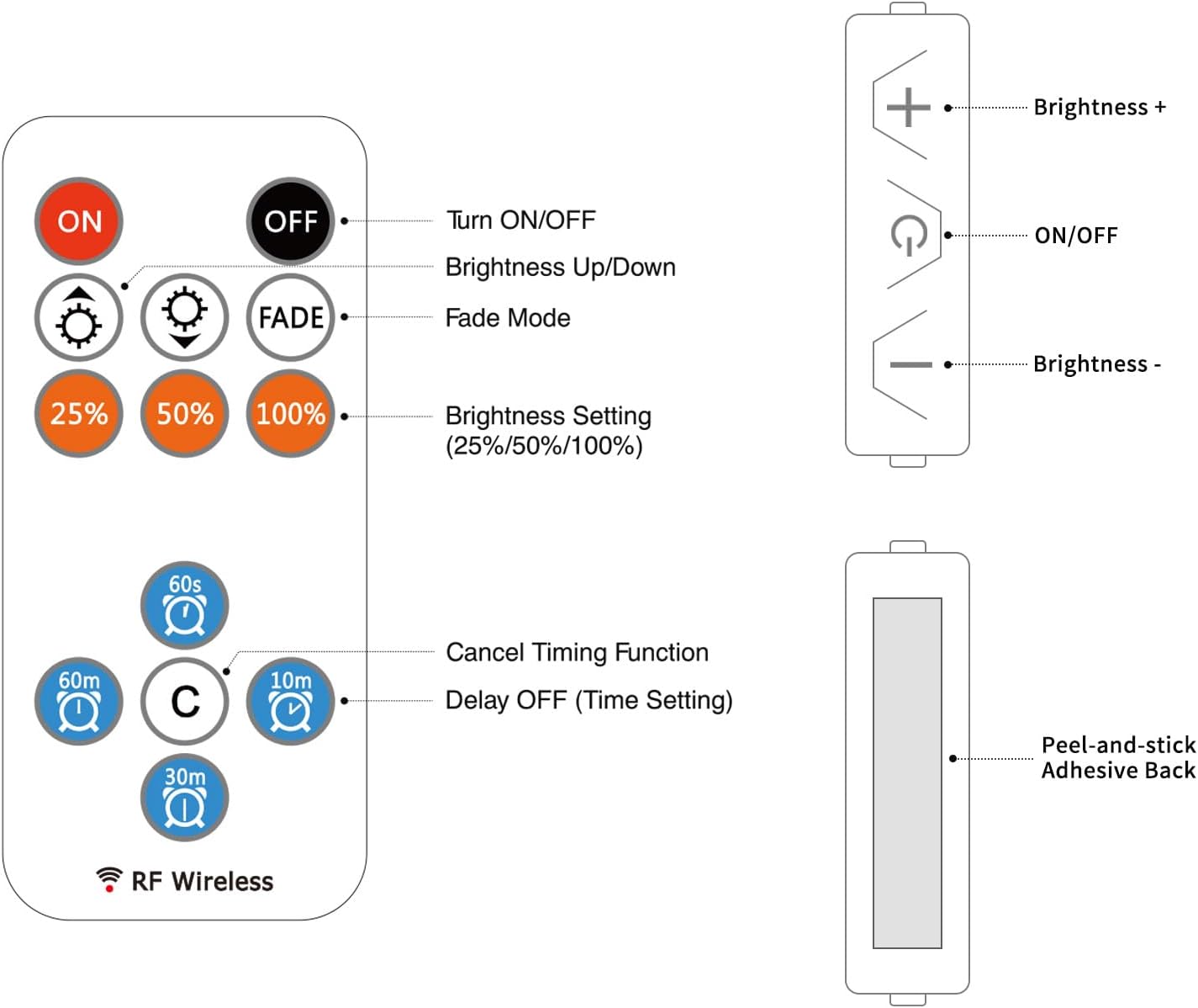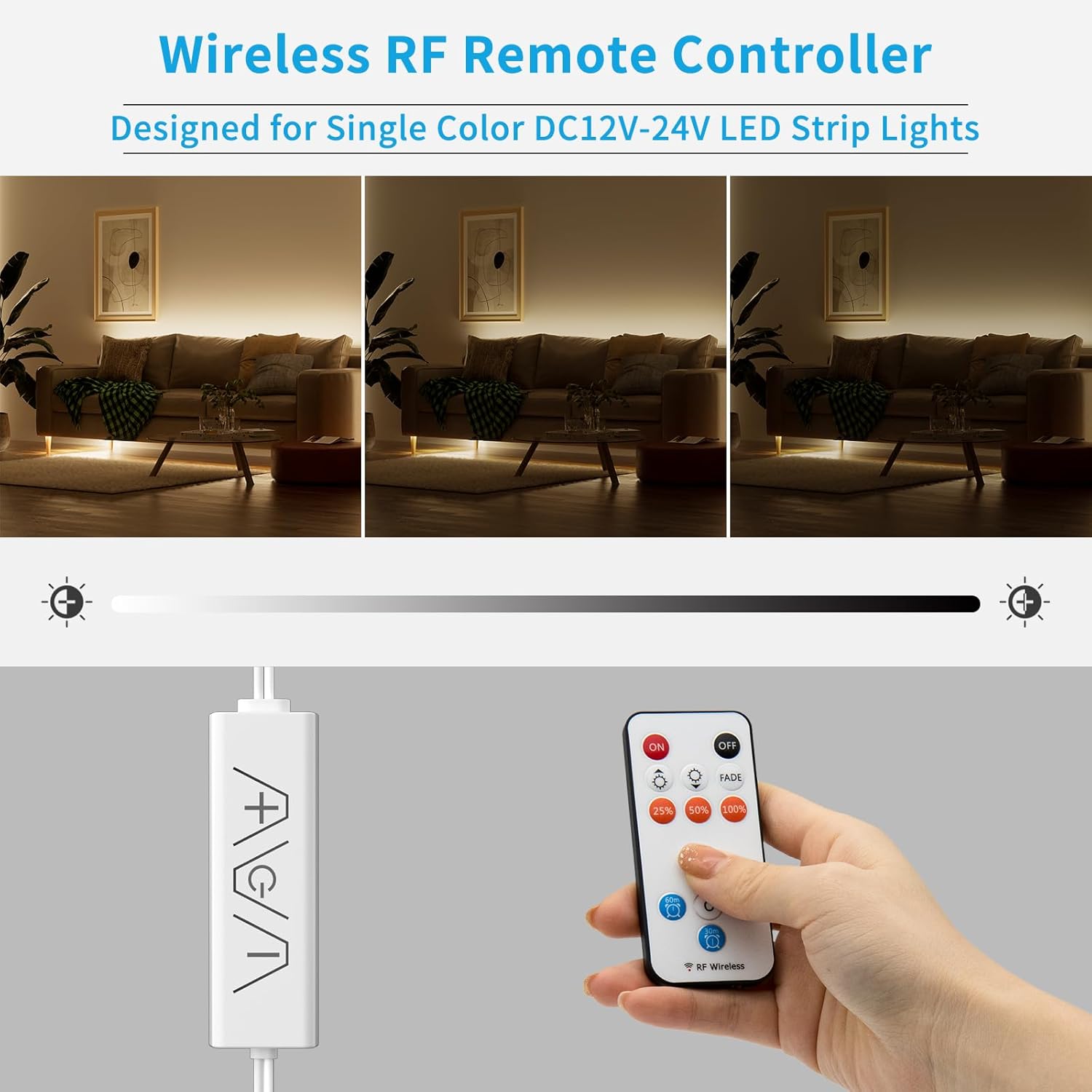 - [Remote Function] - With the RF remote control, there are 11-level brightness dimmer (5%-100%),fade modes, 3 pre-set adjustable brightness(25%,50%,100%), and 4 timer setting, you can control the LED strip light within 15m/49ft in open area. You can use one remote to control 3 receivers simultaneously.