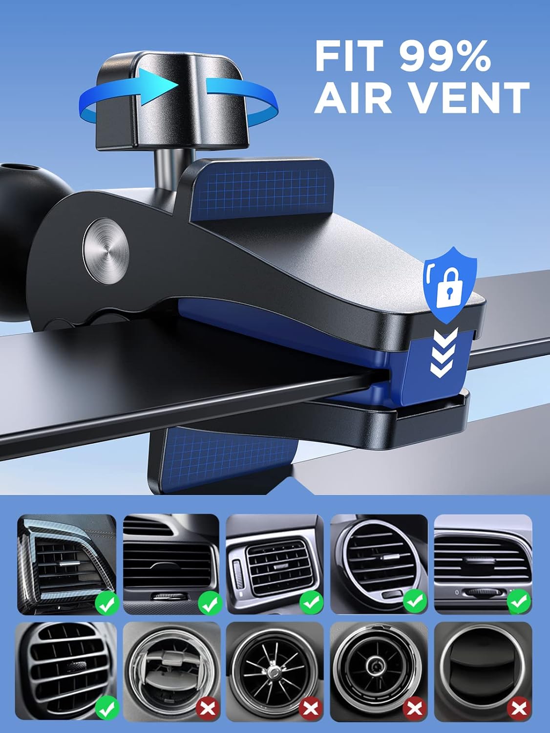 - Anti-Shake Vent Clip: 2024 upgraded air vent clip, it has more compatibility, perfect for 99% air vent vertically and horizontally. Anti-shake than ever with the triangular fixation, no more wiggle loose or phone shaking out over rough roads or railroad tracks