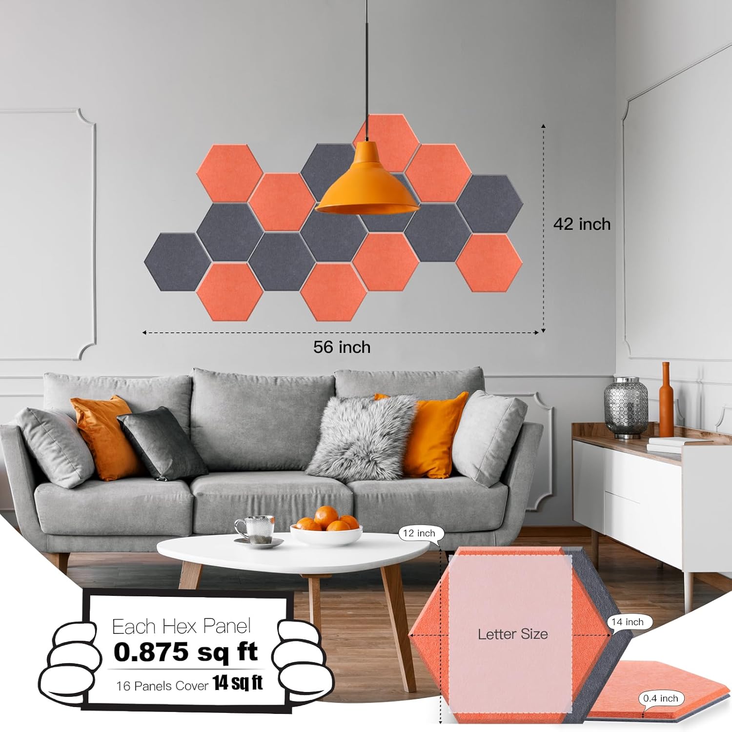 Mollywell Hexagon Acoustic Panels, High Density, Soundproofing, Decorative Noise Reduction Felt Wall Tiles for Ceilings, Home Office & Gaming Room (Moon Gray and Orange), 14x12x0.4 Inch