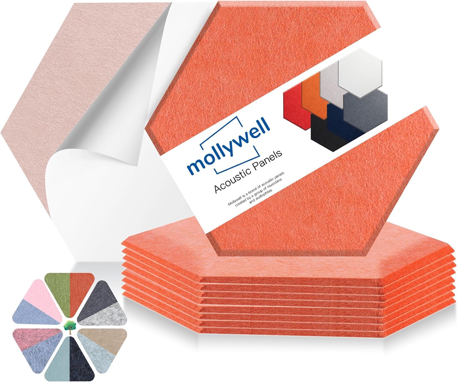 Mollywell Hexagon Acoustic Panels, High Density, Soundproofing, Decorative Noise Reduction Felt Wall Tiles for Ceilings, Home Office & Gaming Room (Orange), 14x12x0.4 Inch