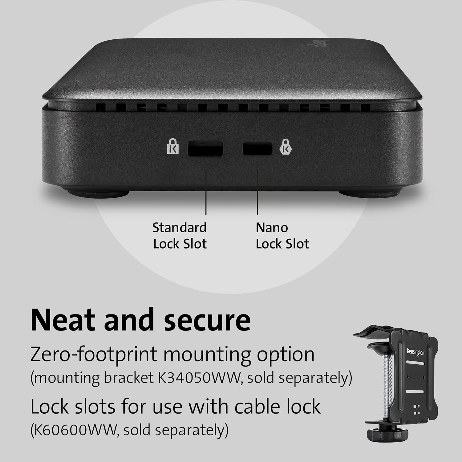- Kensington lock slot for securing your investment (lock sold separately, see part # K60600WW); Vesa mountable, mount dock out of the way with our Vesa mounting bracket (sold separately), see part #K34050WW