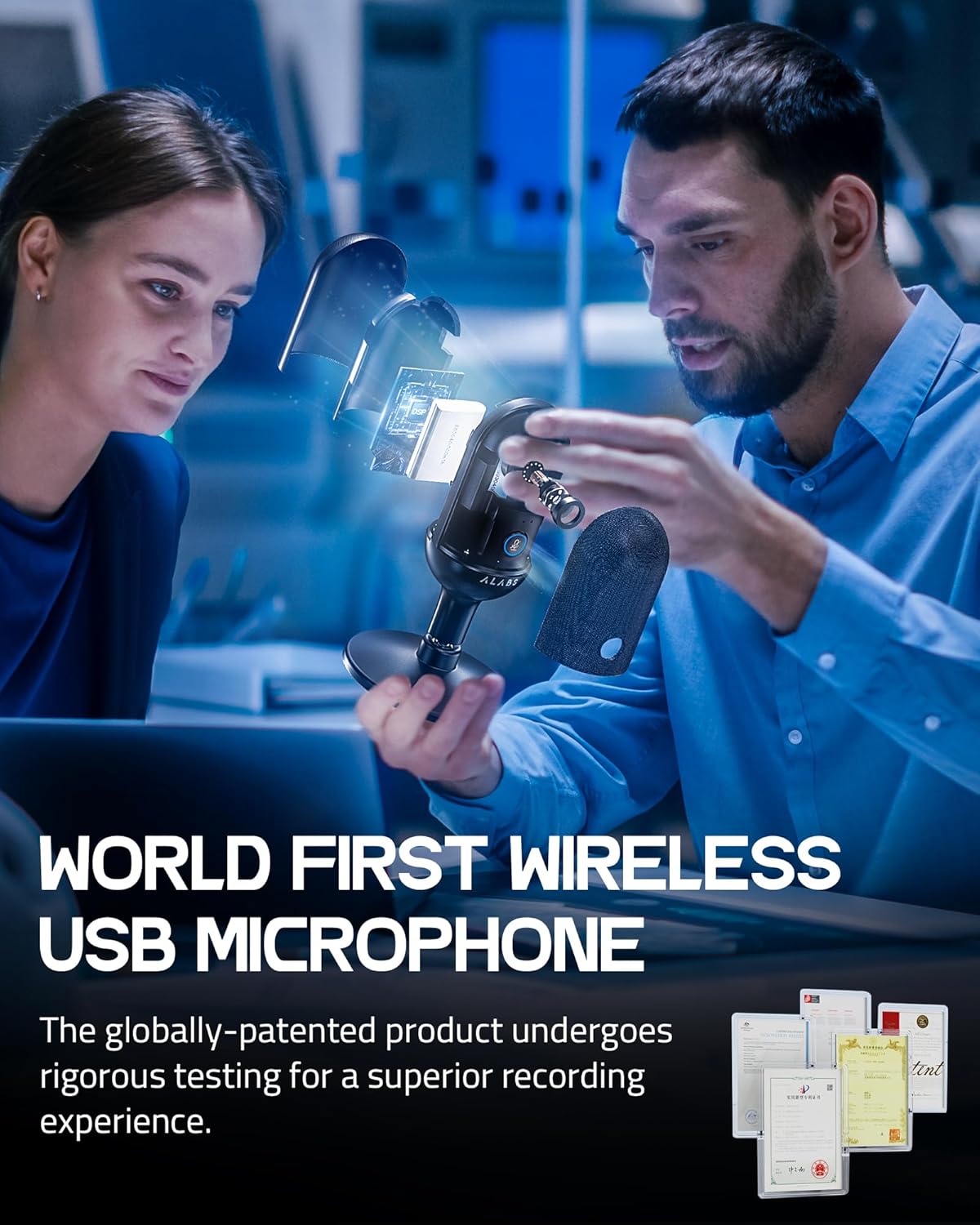 - Market's First Wireless USB Microphone:Are you troubled by the messy connections of your desktop that lead to living broadcast accidents? With the world's first ALABS Wireless Condenser Mic,you can get rid of cables and capture voice from anywhere. The signal transmission distance of ALABS USB Microphone can reach up to 100ft. Whether you want to stand, sit, or move around while you perform,Wireless USB Microphone gives you the flexibility and freedom