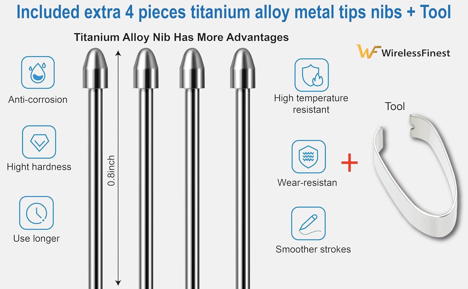 - DURABLE & WEAR-RESISTANT TIPS: Crafted from premium materials made of titanium alloy metal (4 pieces), and design with ballpoint pen that more durable and scratch resistance. Glide across your screen effortlessly, simulating the feel of writing on paper, offering a smooth and pencil-like writing feel,improves work efficiency and extends use time.