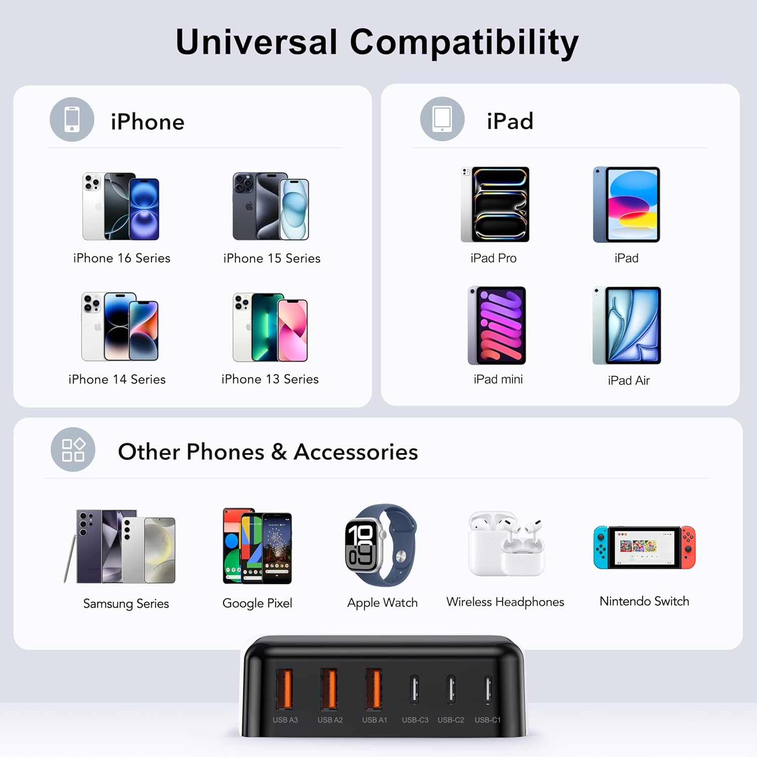 - ⚡【Fast-Speed Desktop Charging Station】Only 30 minutes, charge your phone to 60%. 6 in 1 Charging blocks with 3 x USB C PD 3.0 port (20W max), 3 x USB port(18W max), this charger supports a maximum output of 100 watt in total. No need to wait, it can charge your watch, earphone, mobile phone, fan and other 6 different devices at the same time.