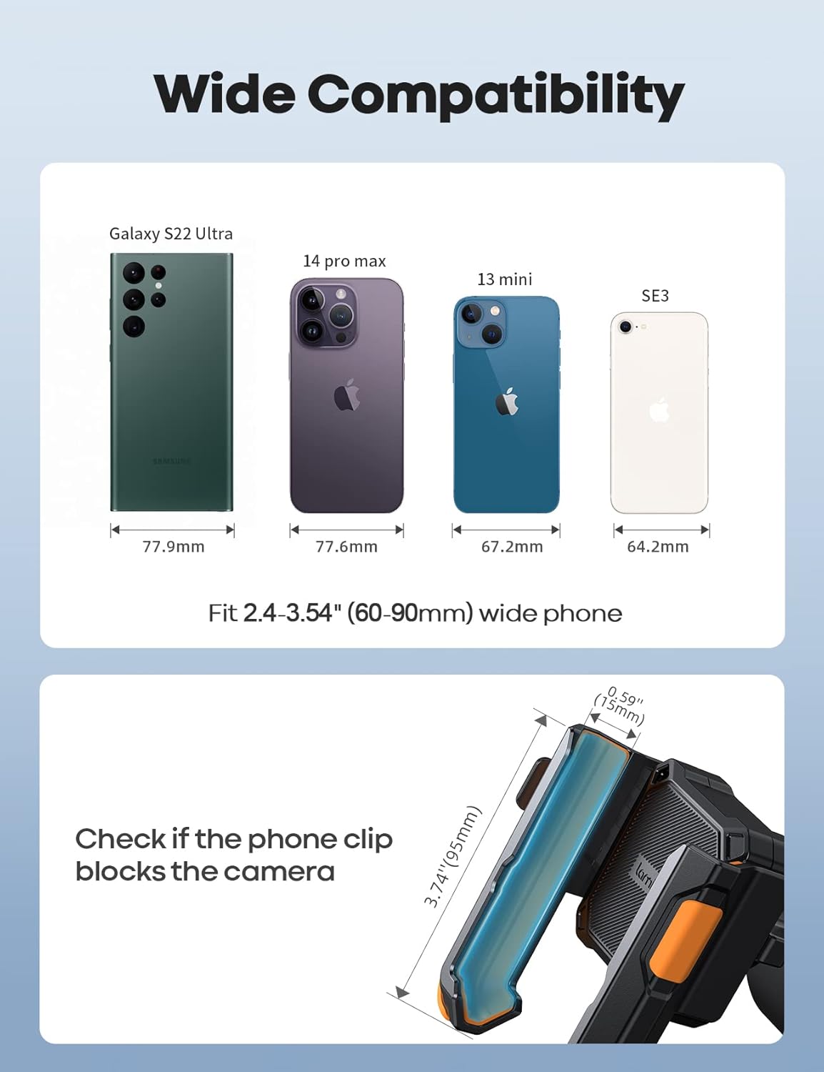 - 【 for 4.7-7" Phones】 This motorcycle phone holder can fits all 2.3 - 3.54" wide phones, such as iPhone 16 Pro Max, 15/ 14/ 13/ 12/ 11 Pro Max, Pro, Mini, iPhone 16/ 15/ 14 Plus, iPhone Xs Max, Xs, XR, X, iPhone SE, Galaxy S25 Ultra, S24 Ultra, S23 Ultra, S23+, S23, S22, S21, more. The max thickness the phone clip can holds is 0.59".