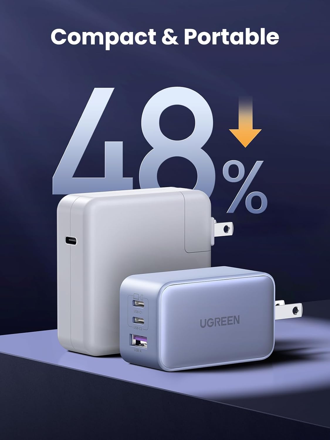 - Travel Friendly, Compact Design: Thanks to a cutting edge GaN chip, Ugreen's 65W USB C charger is 50% smaller than the original 61W USB C charger; A foldable plug provides more portability and a better travel experience