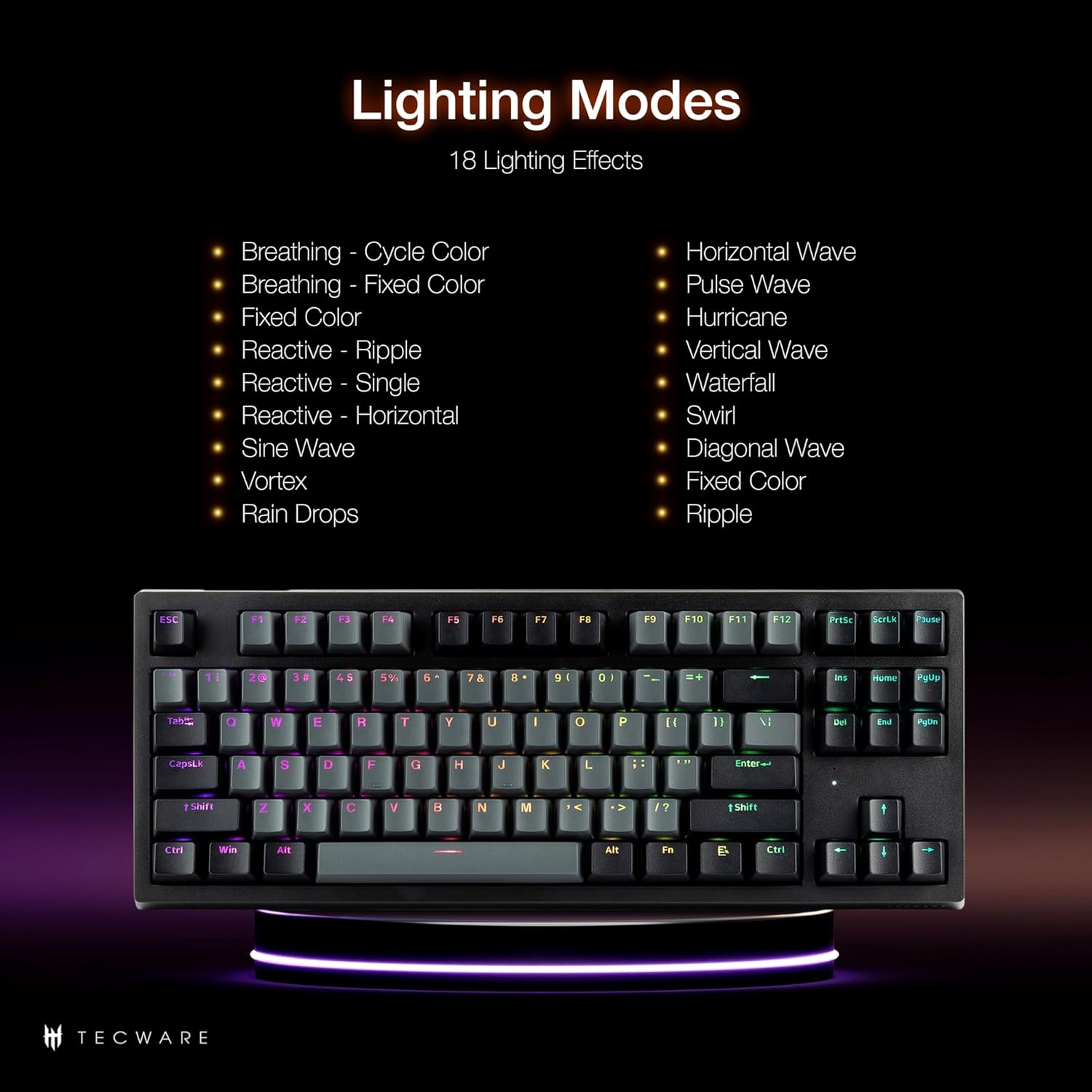 TECWARE Phantom+ Elite 87 Key RGB Mechanical Gaming Keyboard, LED Backlit, Universal Hot-Swap, Wired and Wireless, 3 Mode Connectivity, Thocky Sounding, Black Elite Wraith Brown