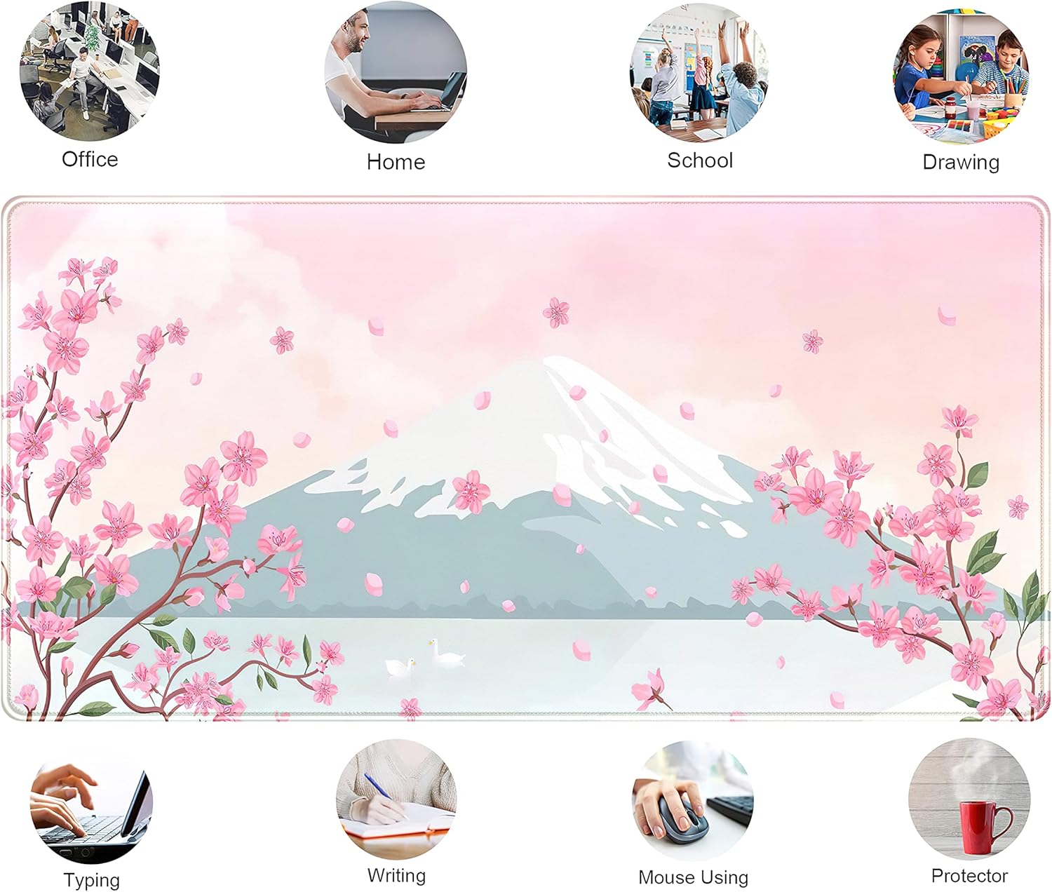 Japanese Desk Mat Pastel Pink Cherry Blossom Mouse Pad Mt Fuji Japan Large Gaming Anime Mousepad XXL 31.5x15.75 in, Kawaii Aesthetic Flower Cute Women Office Decor Computer Laptop Keyboard Mat