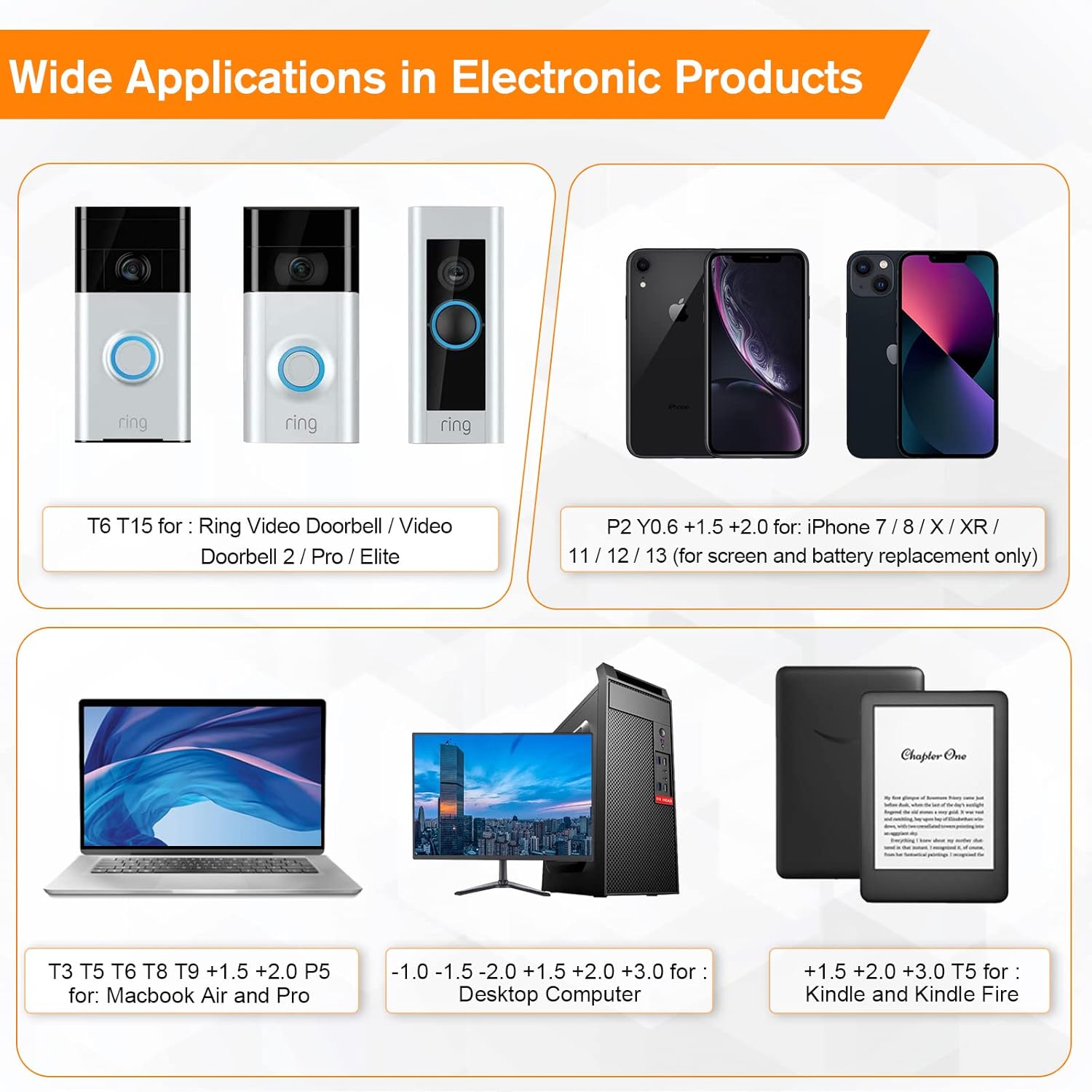 - 【Wide application】-- P2 Y0.6 +1.5 +2.0 are used for iPhone 7/8/X/XR/11/12/13, for their screens and batteries replacement only. T8 +1.5 +2.0 +3.0 are used for PS3/PS4/PS5. T6 T8 T10 are used for Xbox 360/Series S&X. Y1.5 +1.5 +2.0 are used for Switch/Joy-Con/Wii. T6 T15 are used for Ring Video Doorbell/Video Doorbell 2/Pro/Elite. T8 is suitable for Folding knife. T3 T5 T6 T8 +1.5 +2.0 P5 are used for Macbook Air and Pro. -1.0 -2.0 +1.5 +2.0 +3.0 are used for Computer/ Watch/Glasses.