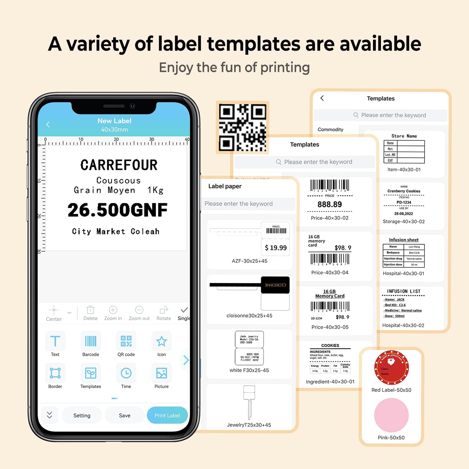 - Easy Use Label Maker Printer : Phomemo Mini Bluetooth wireless thermal mobile label printer, connect your mobile phone easily. There are a lot of templates in APP, you can easily print any label you need, barcode labels, clothing labels, price labels, jewelry labels, address labels, folder labels and so on. Phomemo M110 Label Maker width range of is 20mm~50mm. with 1 roll of 40*30mm thermal label tapes. NoteNot for shipping labels.