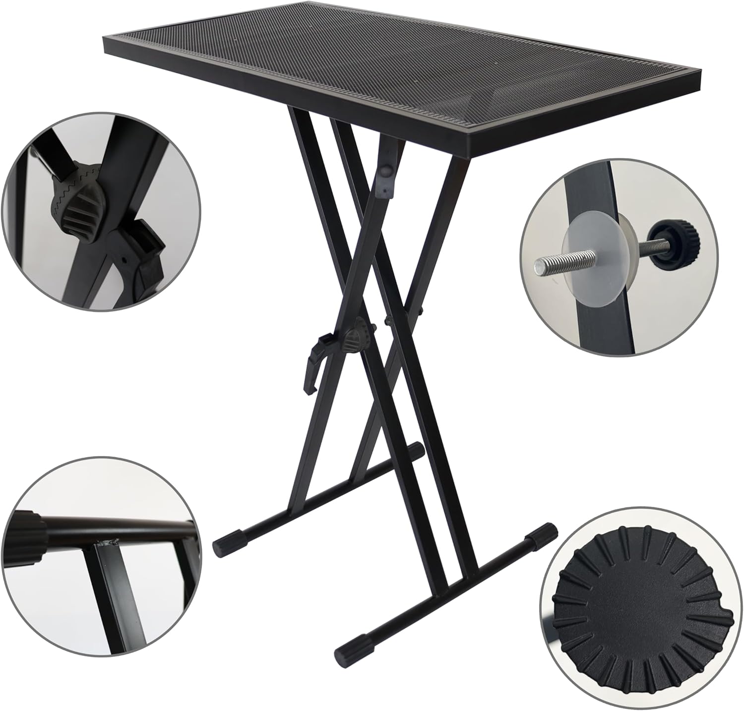 - Easy and fast installation, simply unfold the X-stand and place the tabletop on it. Comes with a professional travel bag to take the DJ Table with you, the medium size is easy to carry or put in the car.