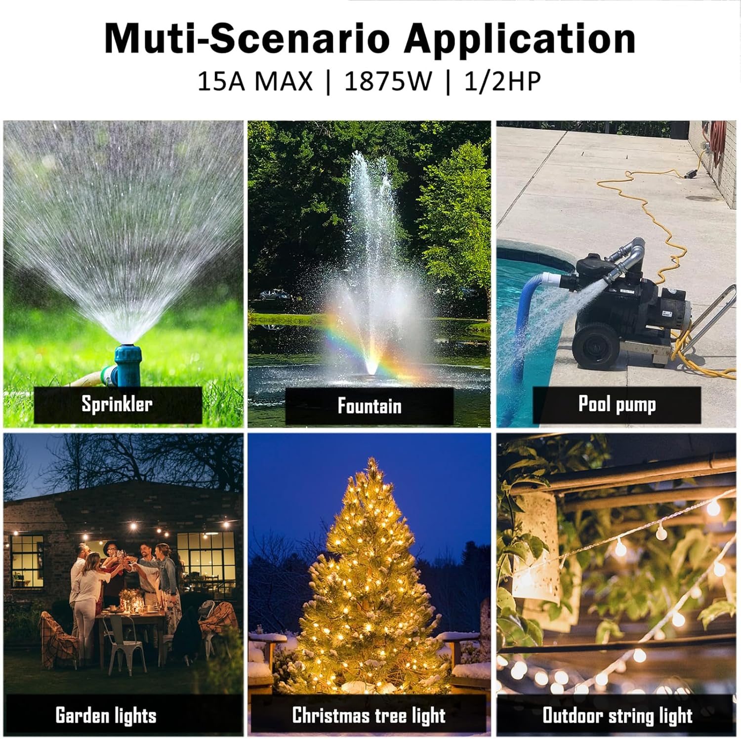 - [CONTROL YOUR OUTDOOR LIGHTS] Avoid the inconvenience of plugging and unplugging your outdoor lights and decorations and let the 24-hr outdoor light timer do the work for you. The timer's 1/2HP capacity allows the timer to be used to control heavy duty devices like pool pumps, aerators, fountains, engine block heaters and more. Ratings: 125V 60Hz, 15A, 1875W resistance or general purpose, 10A tungsten lamp, 1/2HP.