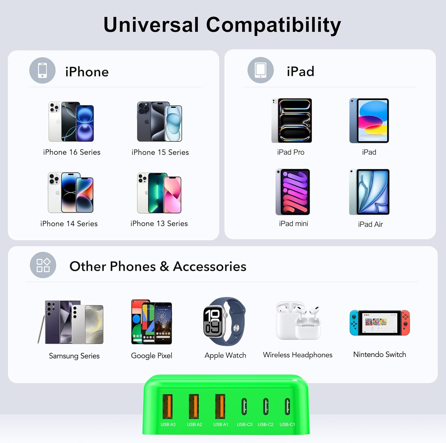 - ⚡【Fast-Speed Desktop Charging Station】Only 30 minutes, charge your phone to 60%. 6 in 1 Charging blocks with 3 x USB C PD 3.0 port (20W max), 3 x USB port(18W max), this charger supports a maximum output of 100 watt in total. No need to wait, it can charge your watch, earphone, mobile phone, fan and other 6 different devices at the same time.