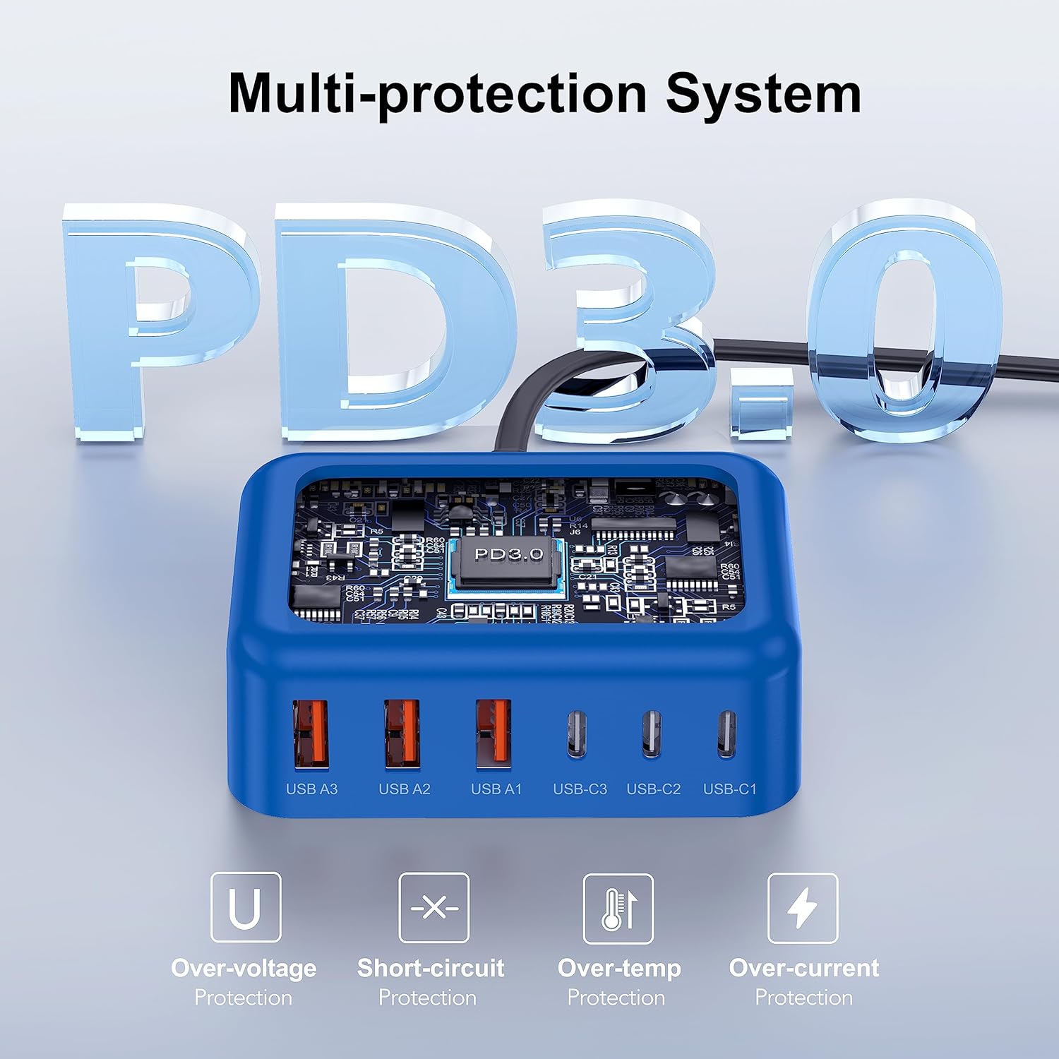- ⚡【Fast-Speed Desktop Charging Station】Only 30 minutes, charge your phone to 60%. 6 in 1 Charging blocks with 3 x USB C PD 3.0 port (20W max), 3 x USB port(18W max), this charger supports a maximum output of 100 watt in total. No need to wait, it can charge your watch, earphone, mobile phone, fan and other 6 different devices at the same time
