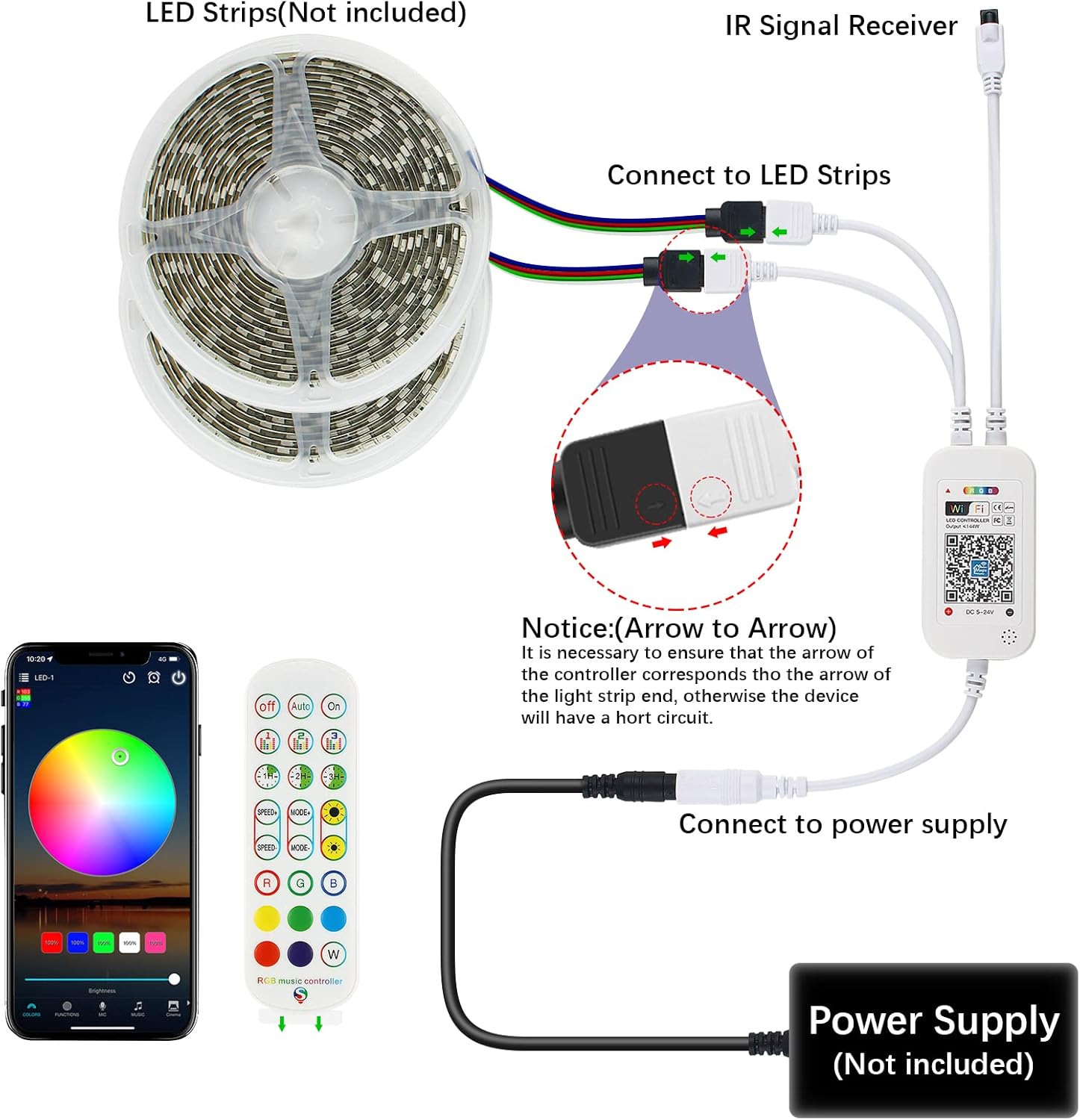 - Note before purchase: Controller's [two control method] and the resulting cautions. a) WIFI connection, APP control: Only for 2.4GHz wireless network, not for 5G network, control distance within 60m; b) 24 keys IR remote control controller: Remote control distance: 5-8m and need to align the remote control to the signal receiving head (remote control comes with a battery, replaceable, model CR2025).