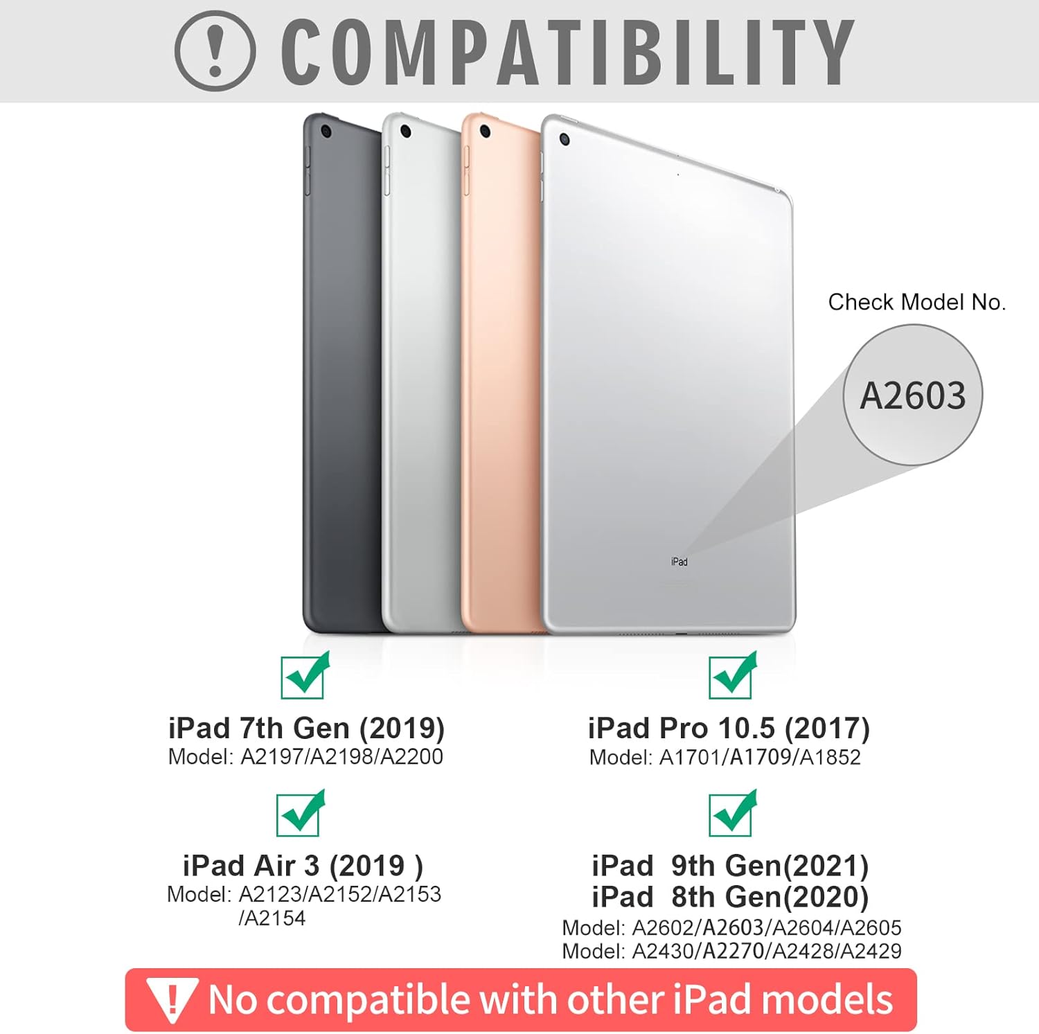 - ✅【Keyboard Case for 10.2"/10.5"】❗❗No pen or charger included!❗❗The keyboard cover is designed for new iPad 9th Generation 2021 (Model number: A2602/A2603/ A2604/ A2605),8th 2020 released (A2430/A2270/ A2428/ A2429), iPad 7th Gen 10.2 inch 2019 released (A2197/A2198/A2200), iPad Air 3 10.5" 2019 released (A2152/A2123/A2153/A2154) and iPad Pro 10.5 inch 2017 released (A1701/A1709/A1852). ♐It's Not compatible with any other devices. Please check the model number of your iPad back bottom.