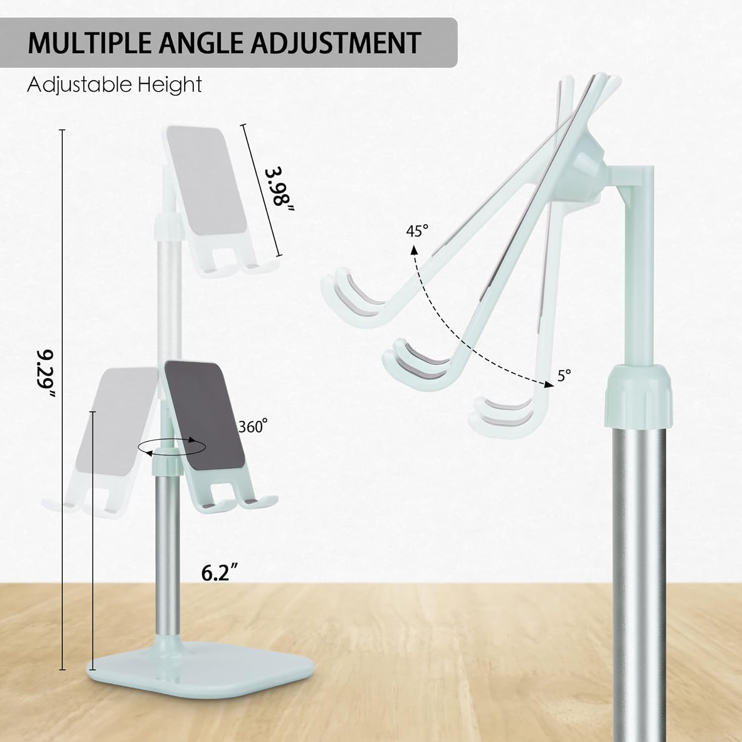 - ADJUSTABLE:This cell phone stand can be easily adjusted to the (0°~ 45°) angle by hand, and it stays firmly in place.The height can be easily adjusted