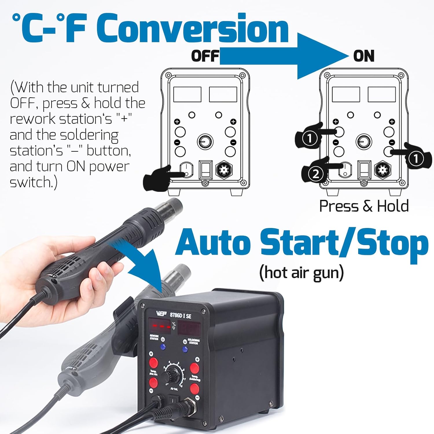 - 2-IN-1: With this soldering iron station you get both the soldering station with hot air rework station in one. This unit comes with individual digital temperature read-out(°F), power switches, adjustable hot air volume, and temperature controls.