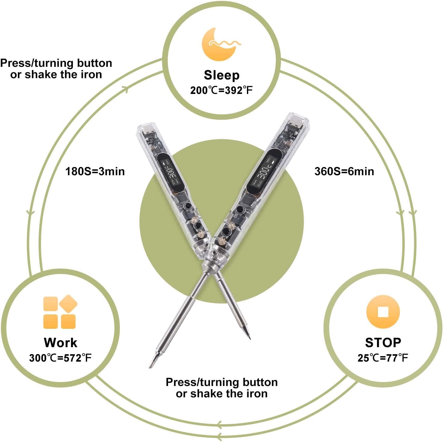 - 3 Modes: This electric soldering iron has 3 modes: work, sleep, and stop. After 3mins without any operation, the solder iron auto sleeps to reduce wear. Through key operations or shaking to wake up the iron. If not woken up after 6 mins, it will auto stops to protect the soldering iron and prolong its lifespan.