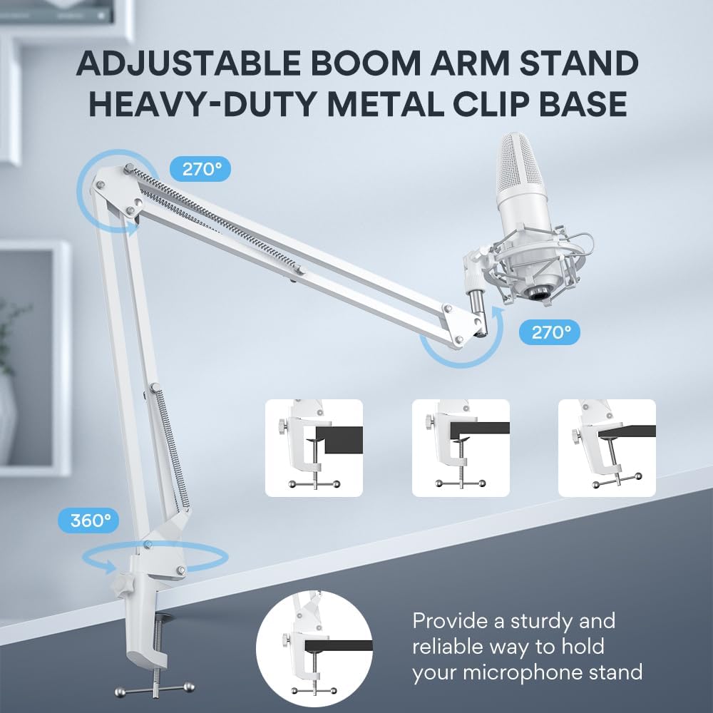 - ăSturdy Boom Arm Setă: With a pop filter and a foam windscreen, the condenser mic records your voice and the sound is crystal clear, the shock mount holds the microphone steady with damping function. Particularly good for video voiceovers; podcasts; YouTube video; skype conferences and so on.